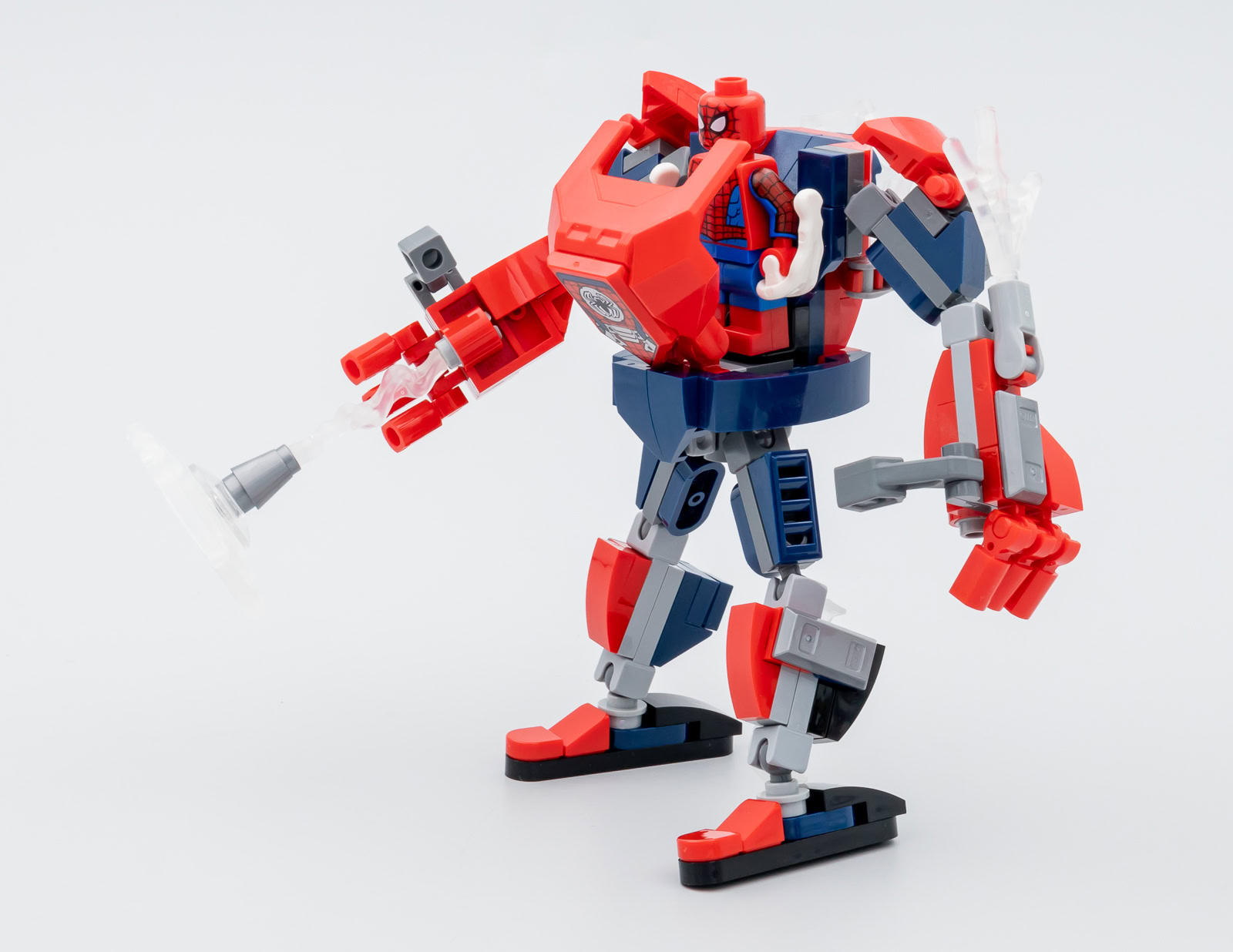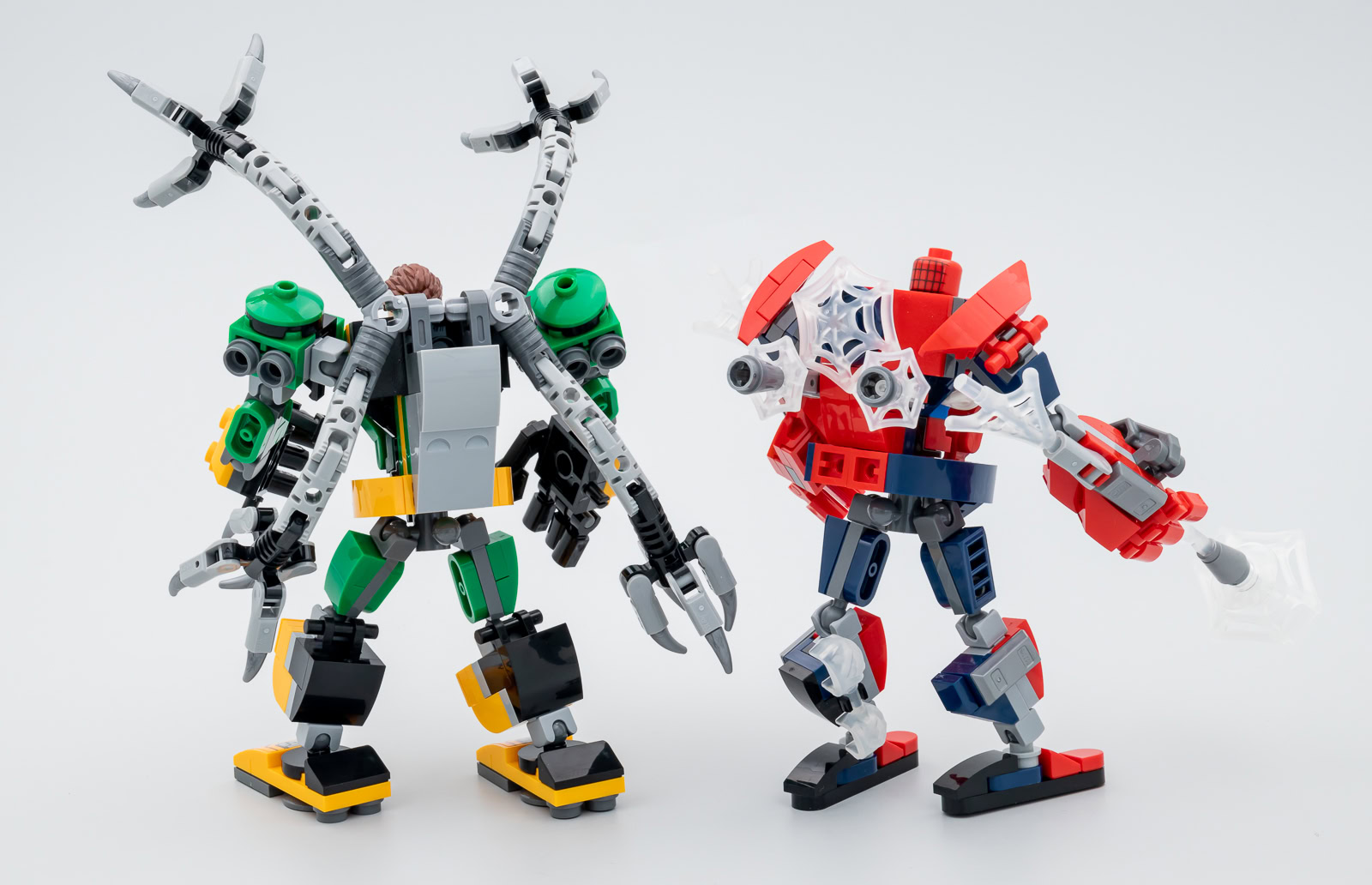 Le mech de Spider-Man livré ici a un peu de mal à tenir la comparaison avec celui de Doctor Octopus : les jambes sont un peu frêles, les pieds sont ridiculement étroits comme ceux du set 76171 Miles Morales Mech et les bras sans vraies épaules se contentent de deux articulations sur Ball Joints au lieu de trois. Même si LEGO facture le double du prix habituel pour ces deux mechs, on sent que celui de Spider-Man est une version économique à l'inventaire réduit. L'étroitesse des pieds nuit un peu à la stabilité de la construction, on cherchera plus longtemps le point d'équilibre.