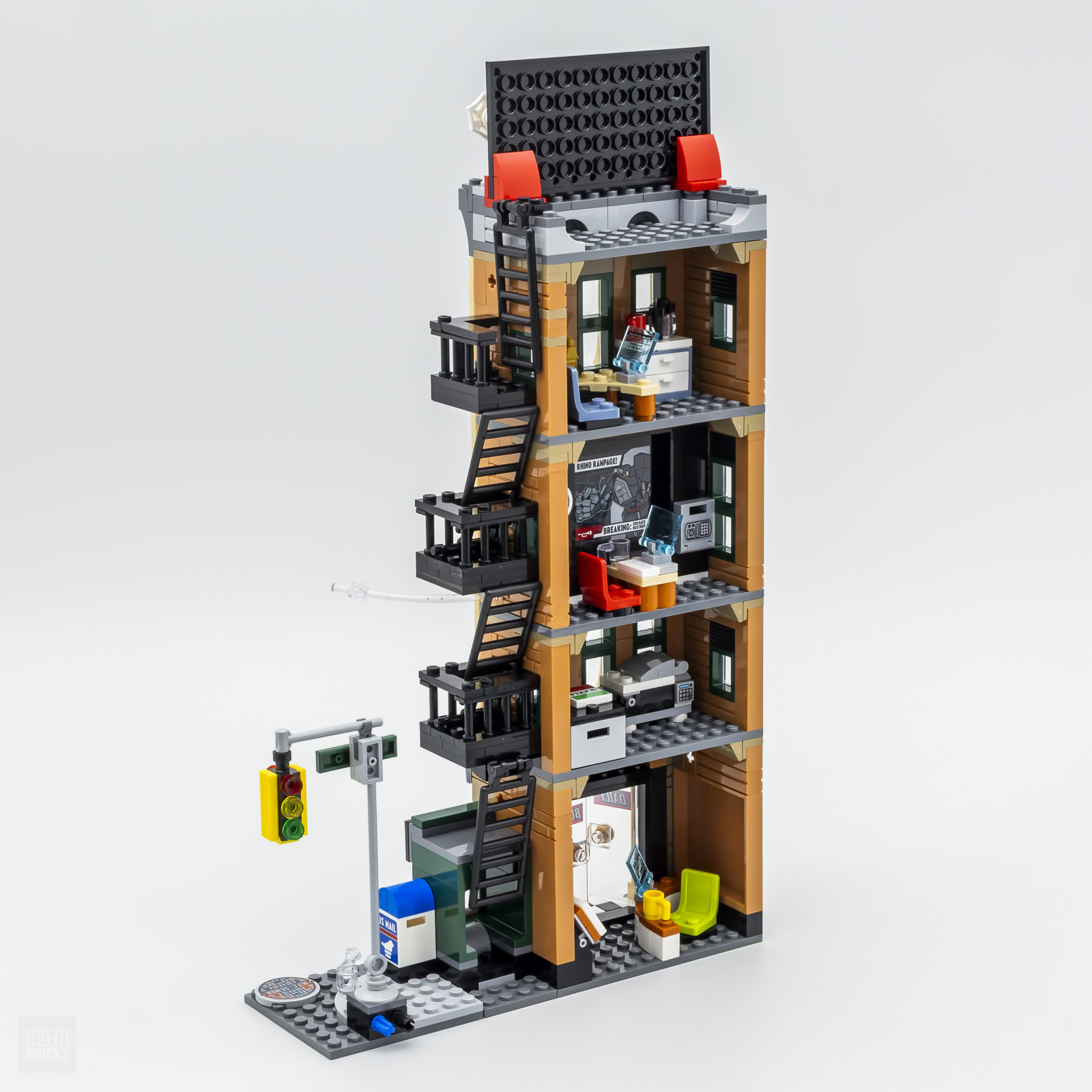 Ce Daily Bugle se paye même le luxe d'être associé à l'inévitable escalier de secours typique ainsi qu'à un bout de trottoir qui donne un peu de contexte et qui élargit au passage la base du playset pour en améliorer la stabilité. Les pins de connexion qui permettront d'associer la construction aux autres produits du même tonneau sont présents, il ne reste plus qu'à repasser à la caisse.