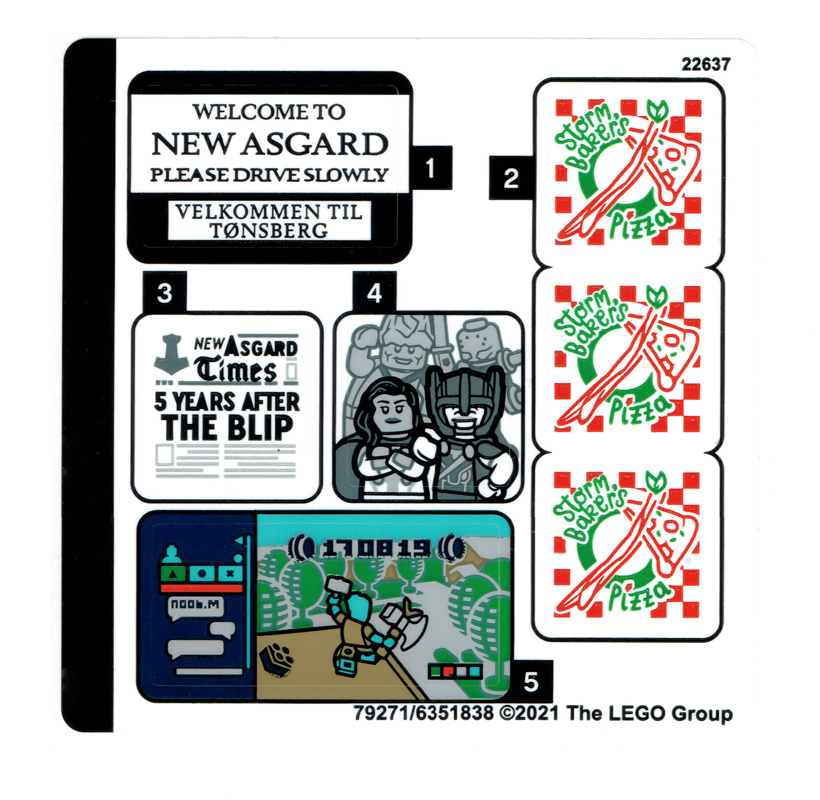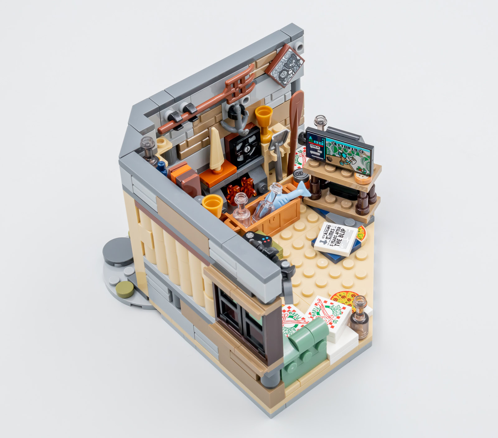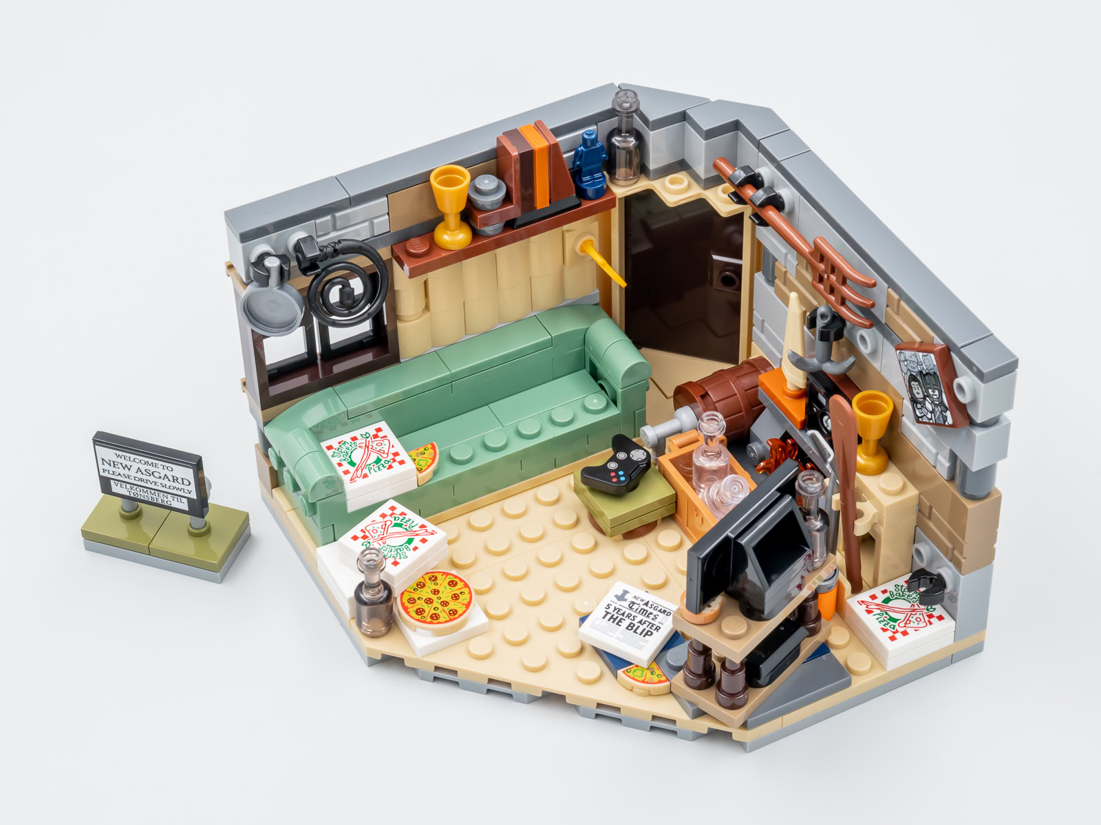 On échappe de peu aux références à l'alcool grâce à quelques bouteilles vides, LEGO sachant rester dans les limites de ce qui est acceptable pour un produit affiché comme destiné aux enfants âgés d'au moins 7 ans. La planche de stickers est plutôt conséquente pour un set de cette envergure avec sept autocollants dont trois pour les couvercles de boites de pizzas qui traînent et une capture d'écran de Fortnite en version LEGO. On obtient par ailleurs deux manettes de consoles et deux statuettes en Dark Blue, l'élément n'étant présent qu'une fois dans le diorama mais il est fourni en double dans la boite.