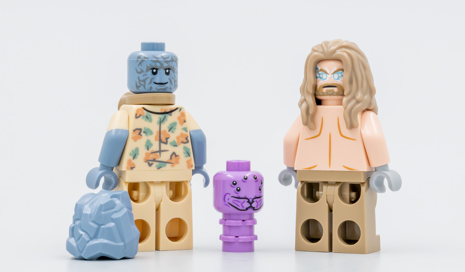 LEGO a fait l'impasse sur une longue barbe en plastique pour Thor en se contentant de tampographier la tête du personnage et c'est un choix judicieux qui nous évite une minifig en mode Père Noël dont le visage est noyé sous le plastique. Pas de lunettes noires sur l'autre visage de Thor, LEGO utilise le même élément que dans les sets 76192 Avengers Endgame : Final Battle et 76193 The Guardians' Ship.