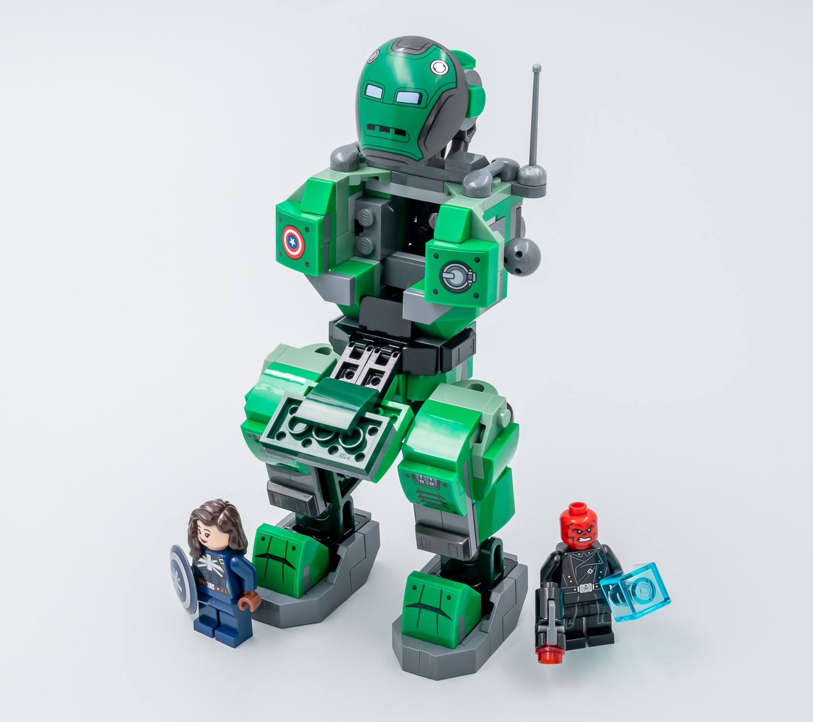 Le robot n'est pas un modèle qui révolutionne le genre, les articulations à base de Ball Joints n'offrent qu'une gamme de mouvements très limitée et la finition est tout juste correcte. Le modèle a tout de même de l'allure et à part la jonction entre les épaules et les avant-bras qui est un peu trop visible et fragile, le reste des articulations est bien intégré. Pas de genoux, c'est la règle chez LEGO. Le casque du mech, basé sur l'épaulette déjà utilisée dans le set 76190 Iron Monger Mayhem (2021) ou pour Molten Man et Venom, vient se rabattre sur le visage de Steve Rogers, c'est bien réalisé même la connexion du casque sur le corps du mech est un peu fragile.