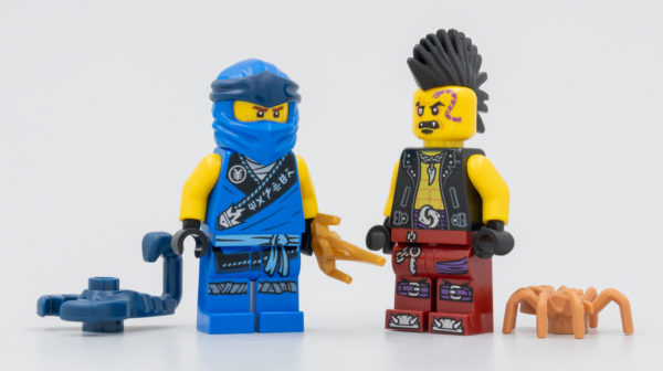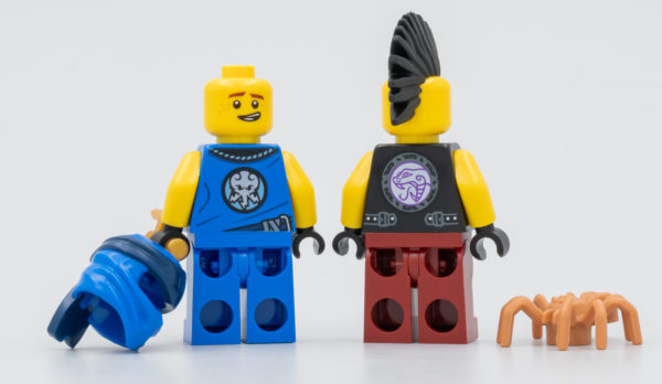 En marge du Mech et du canon Anacondrai sur roulettes, on obtient ici deux minifigs : le jeune ninja bleu Jay et le méchant Eyezor. La minifig de Jay combine des éléments plus ou moins courants dans la gamme Ninjago : la tête est celle utilisée pour le personnage depuis 2017, le torse et les jambes sont aussi présents dans les sets 71735 Tournament of Elements et 71737 X-1 Ninja Charger commercialisés cette année. Le masque est de son côté au catalogue LEGO depuis 2019 sous cette forme.