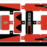 Sur le plan de la finition, c'est compliqué. Le modèle proposé ici n'étant pas une version compétition bardée de sponsors, on se retrouve logiquement avec un nombre réduit de stickers et c'est une bonne chose. Malheureusement, on se retrouve aussi avec trois nuances de rouge entre la couleur des pièces, celle de l'encre des stickers et celle de la zone rouge tampographiée sur la verrière. Je ne m'étalerai pas sur les pathétiques phares avant en deux stickers qui sont un élément important de l'esthétique du véhicule et qui sont ici relégués au rang de simples détails sur papier collant.