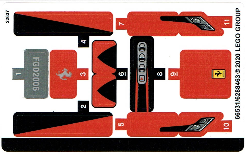 Au rayon des pièces tampographiées, on obtient deux boucliers Nexo Knights rouges avec une zone noire, la pièce qui se trouve à l'avant du capot juste derrière le logo et deux pièces 1x1 avec un micro logo Ferrari à placer sur les ailes avant. Comme d'habitude, le volant est décalé, mais il y a de la place pour deux minifigs à l'intérieur du poste de pilotage qui est malheureusement "ventilé" par l'espace disponible entre les vitres latérales et les portières.