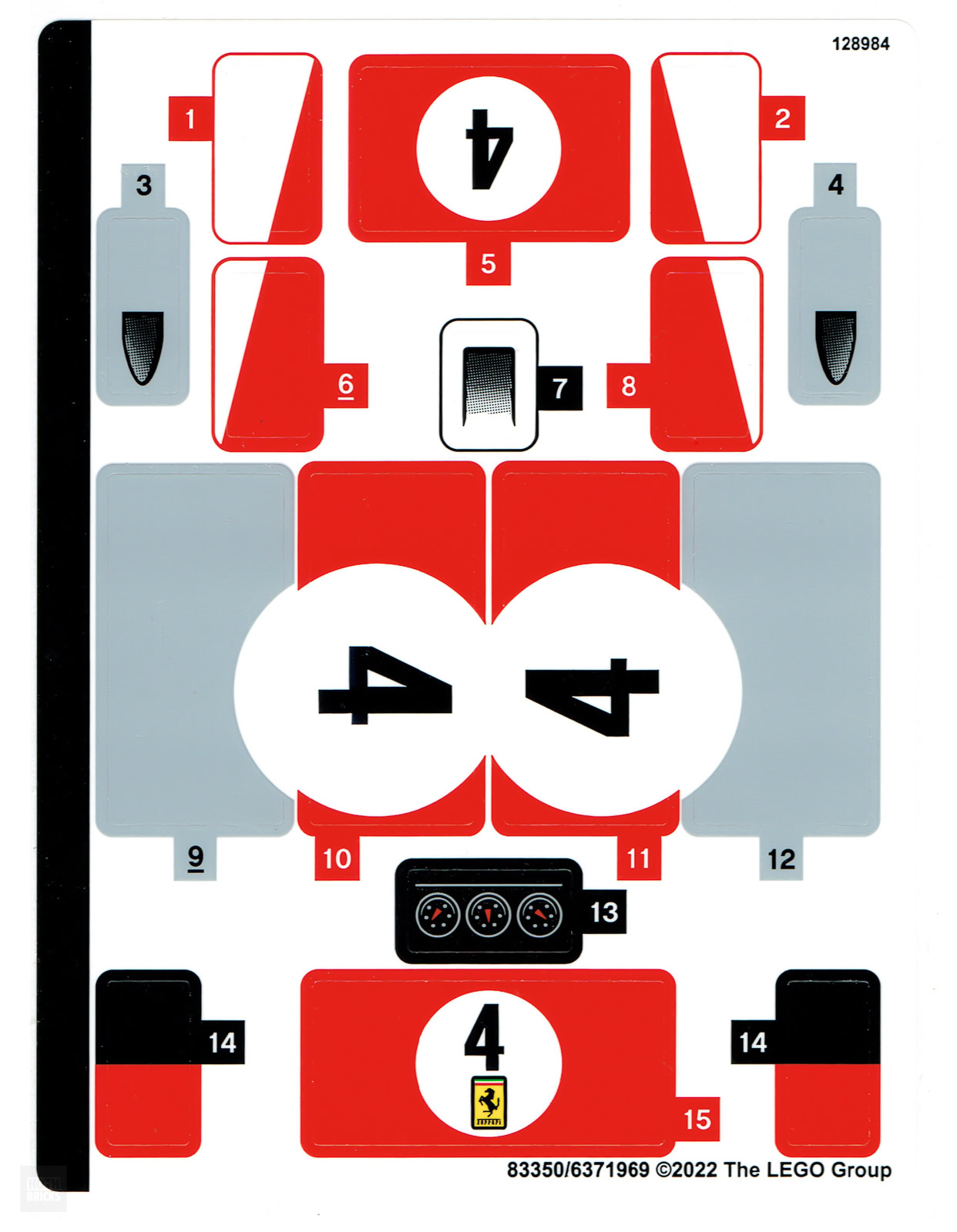 L'assemblage est comme d'habitude rapidement expédié et il faut évidemment appliquer une grosse poignée de stickers pour habiller cette Ferrari 512 M et recréer quelques détails esthétiques. La verrière et les deux Tiles utilisées sur le côté des phares avant sont tampographiées, tout comme le logo Ferrari présent sur les pièces 1x1 placées sur les flancs du véhicule. La verrière et les flancs des phares sont d'un Dark Red mal assorti, c'est un peu dommage sachant que les stickers sont eux parfaitement raccords. LEGO fournit au passage une demi-douzaine de ces pièces 1x1 flanquées du logo Ferrari, mais quatre d'entre elles sont installées dans des zones non exposées.