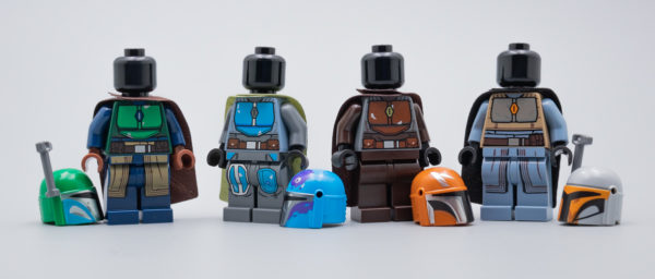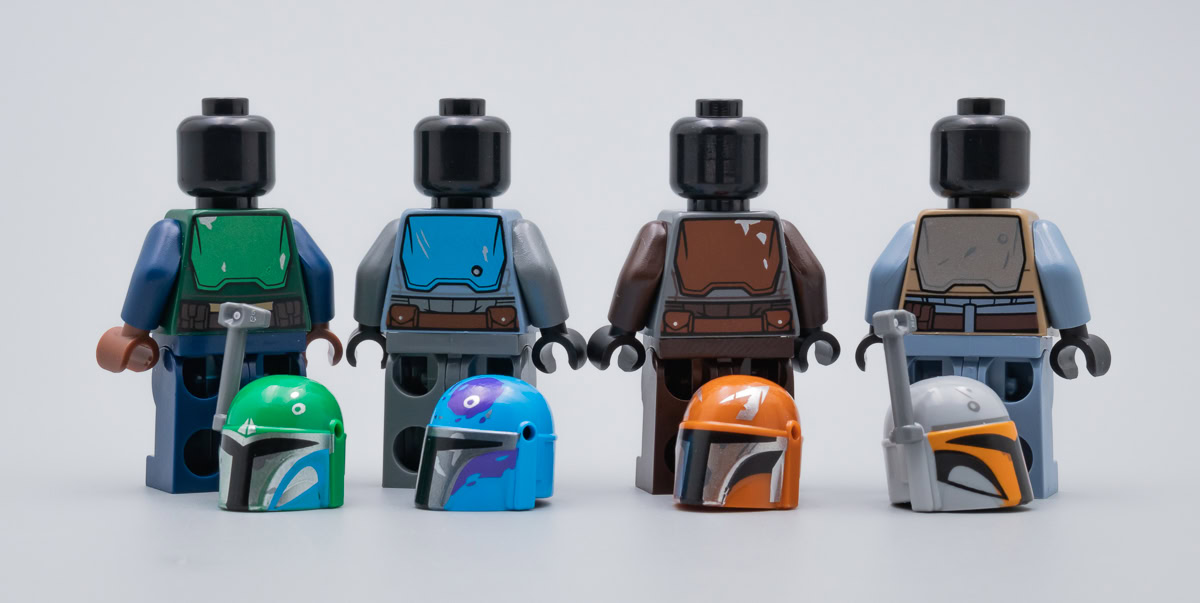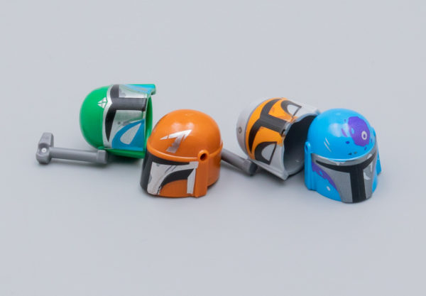 Sous les quatre casques, on obtient des têtes neutres, ce n'est de toute façon pas le propos ici de donner un visage à ces Mandaloriens. Deux des casques bénéficient d'un design avec une visière d'une forme identique à celle de Bo Katan (The Clone Wars, Rebels) et Sabine Wren (Rebels), on peut donc en déduire qu'il s'agit éventuellement de personnages féminins. L'équilibre est respecté, LEGO évite ainsi les éventuelles critiques du type "et pourquoi les femmes peuvent pas être des mandos, etc..."