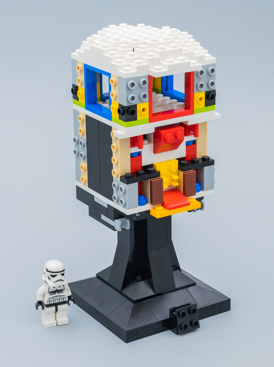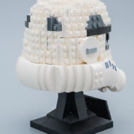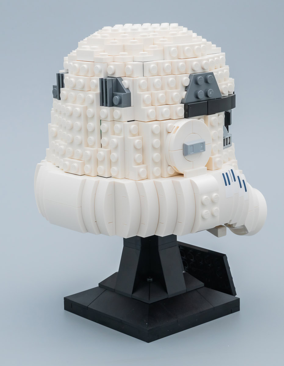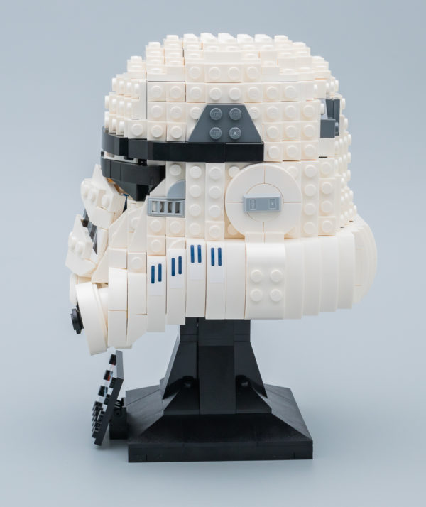Même si je vous ai collé une minifig à côté du casque sur certaines photos, je pense que le produit se suffit à lui-même sans la présence d'une figurine de Stormtrooper dans la boite : le public visé par ces produits est bien plus large que celui des fans de LEGO et cette tentative de séduire un public d'amateurs de produits d'exposition basés sur la saga doit à mon avis se concentrer sur l'essentiel. Je trouve malgré tout que LEGO a été un peu timide sur ce dossier au niveau de l'échelle du produit final : ce casque ne fait finalement que 13x13x13 cm sans le socle qui lui permet de prendre un peu de hauteur et d'atteindre 18 cm de haut.