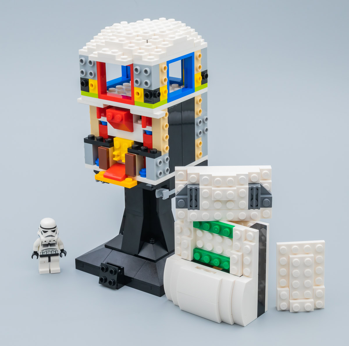Pas de grosse surprise ici, lorsque la structure interne est assemblée, on commence à ajouter les différents éléments texturés à grands renforts de tenons apparents qui vont donner progressivement sa forme finale à ce casque de Stormtrooper. Le designer s'en tire à mon avis honorablement compte tenu de l'échelle choisie et des courbes et autres décrochés à reproduire. On pourrait discuter de certains angles ou de certains volumes, mais c'est à mon avis inutile de chercher la fidélité absolue au modèle de référence à cette échelle.