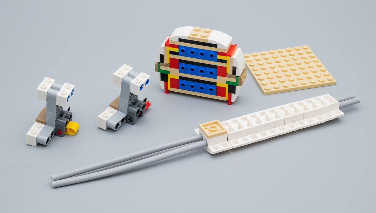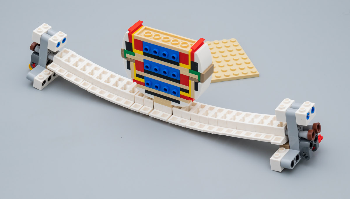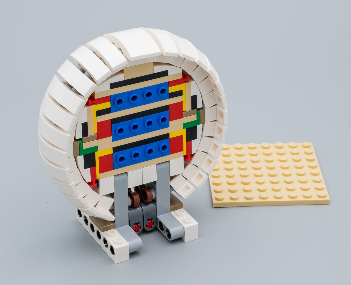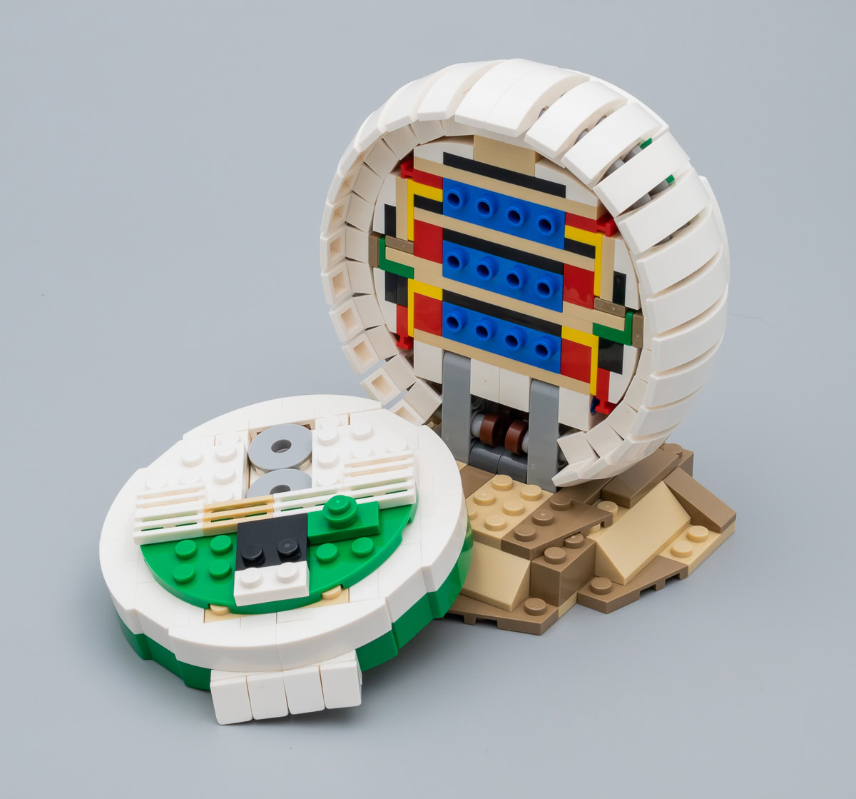L'assemblage du modèle est plutôt intéressant avec quelques techniques originales qui permettent de réaliser la roue du droïde. La "ceinture" de pièces enfilées sur des tubes souples qu'il faut ensuite courber pour obtenir la bande de roulement est bien pensée et même si on doute un instant de la fiabilité de la solution imaginée par le designer, il faut reconnaître que tout se met correctement en place lorsqu'il s'agit de connecter les deux extrémités du bandeau sur la partie interne de la roue. Deux panneaux latéraux reprenant les différents détails vus à l'écran sur le corps du droïde finissent de combler les espaces et le tout est monté sur le support de présentation. À ce stade, on comprend évidemment que la roue ne tourne pas sur elle-même et c'est un peu dommage.