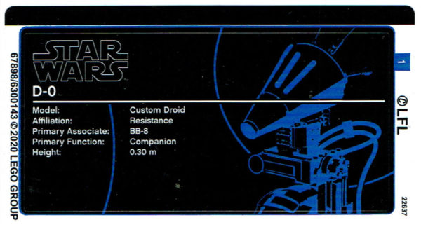 Comme c'était déjà le cas pour les sets 75187 BB-8 et 75230 Porg, il s'agit ici d'assembler un modèle d'exposition de l'une des nombreuses mascottes que l'univers LEGO Star Wars nous impose au fil des épisodes de la saga. D-O est donc le personnage qu'on aime ou qu'on déteste dans le dernier épisode en date et LEGO nous en propose une adaptation à base de briques qu'on nous vend comme un produit pour collectionneur accompagné de sa plaque de présentation.
