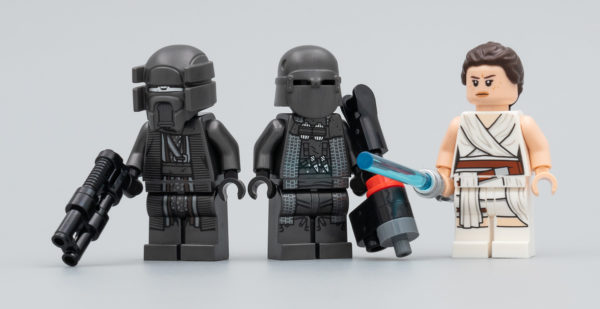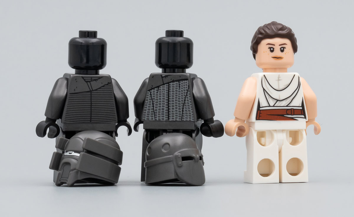 Trois minifigs sont fournies dans cette boite : Rey Palpatine (elle ne s'était pas encore auto-adoptée à ce stade du film), Cardo et Kuruk. La minifig de Rey est celle déjà vue dans le set 75250 Pasaana Speeder Chase (2019). Difficile d'en vouloir à LEGO de nous livrer à nouveau cette version, c'est raccord avec le film, même si une variante inédite avec quelques traces de poussière sur la tunique aurait permis de remplir un peu plus nos cadres Ribba.