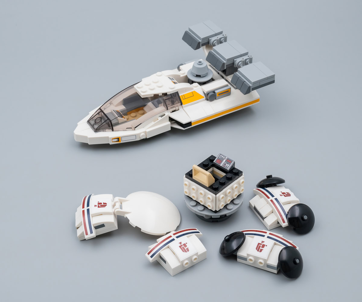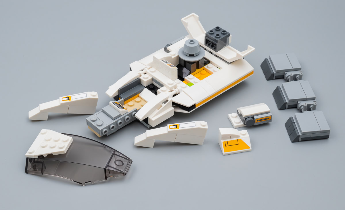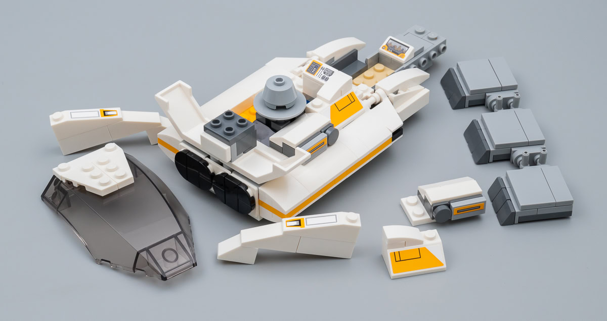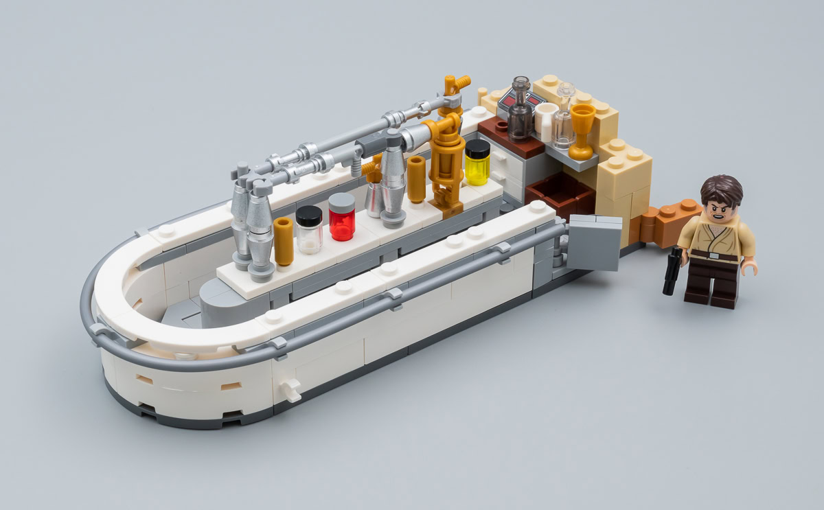 Une version de la capsule Ubrikkian 9000 Z001 était déjà livrée en 2018 dans le set 75205 Mos Eisley Cantina. Celle fournie ici est une variante elle aussi habillée de nombreux stickers. L'autre speeder fourni dans cette boite est un peu plus intéressant, il s'agit d'un V-35 Courier Landspeeder inédit chez LEGO et vu brièvement pour la première fois à l'écran aux abords de la Cantina. L'engin ne méritait sans doute pas d'apparaître dans un set au contenu limité et au tarif plus modeste, mais sa présence ici contribue vraiment à mettre le bâtiment principal dans le contexte vu à l'écran.