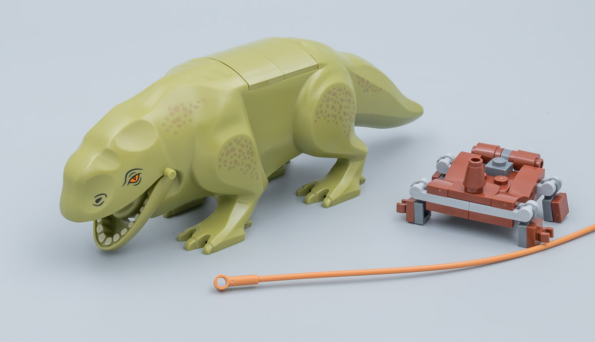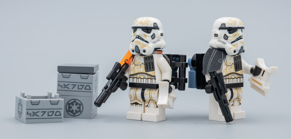 Le reste du casting est déjà présent au catalogue LEGO, soit à l'identique soit dans une variante suffisamment proche. Même le moule utilisé ici pour le Dewback est celui déjà utilisé pour la créature vue dans le set 75052 Mos Eisley Cantina commercialisé en 2014, et il faut simplement se contenter d'une nouvelle tampographie plus contrastée qui en fait donc une créature "exclusive". L'attirail amovible et remplaçable par des éléments neutres qui permet au Sandtrooper de chevaucher la créature est identique à celui de 2014.