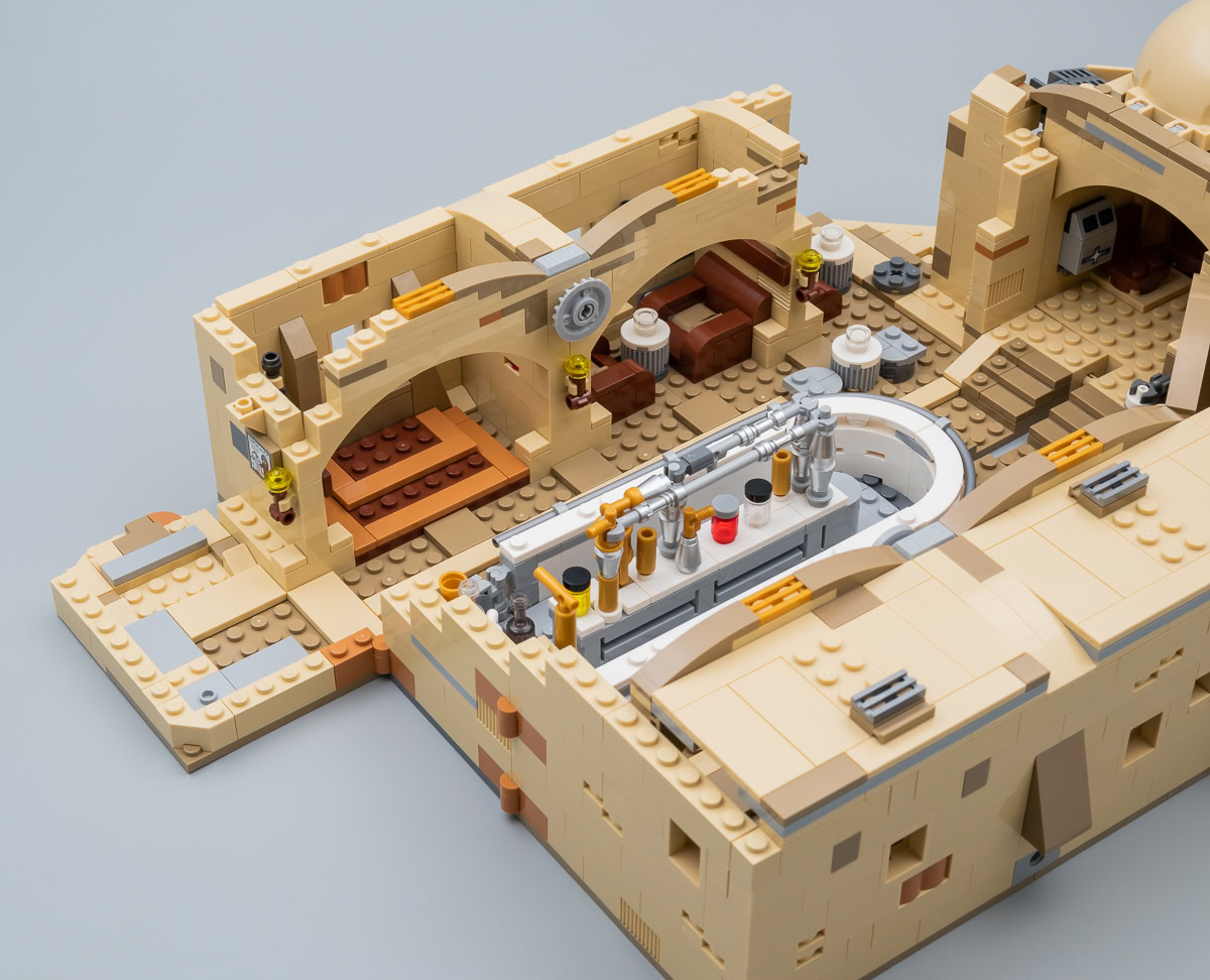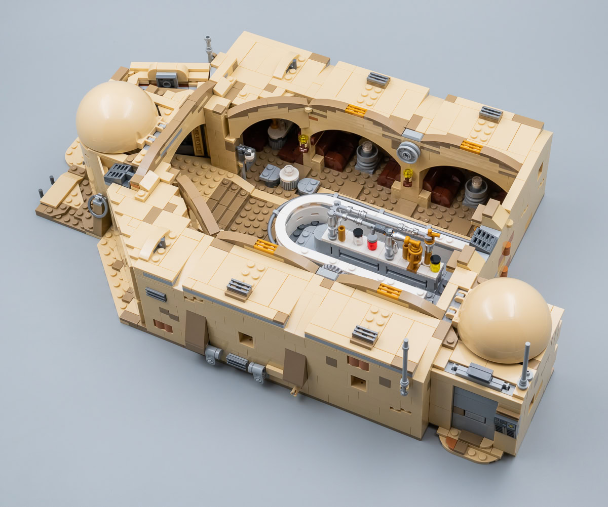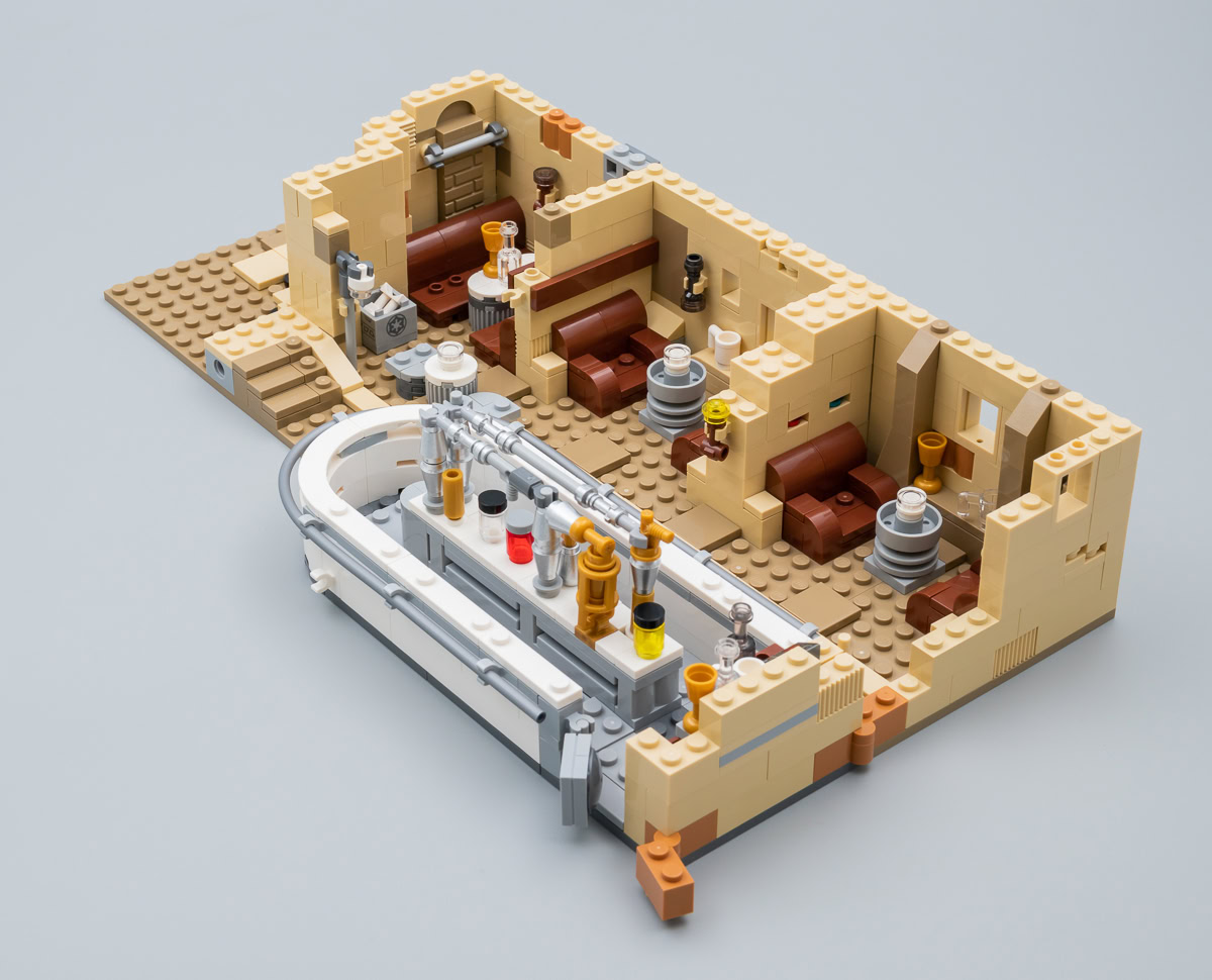 Les mauvaises langues trouveront que cette reproduction de la Cantina est à peu de choses près le résultat de l'assemblage de trois ou quatre exemplaires du playset beaucoup plus sommaire vu dans le set 75052 Mos Eisley Cantina commercialisé en 2014. Et ils n'auront pas totalement tort : on y retrouve les mêmes techniques d'assemblage jusque dans certains détails. Ne cherchez pas ici de prouesses en matière de design, le set est sur cet aspect du niveau des jouets habituels de la gamme LEGO Star Wars, le gigantisme et la modularité en plus.
