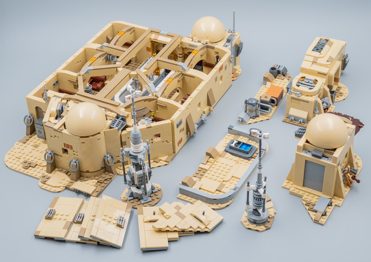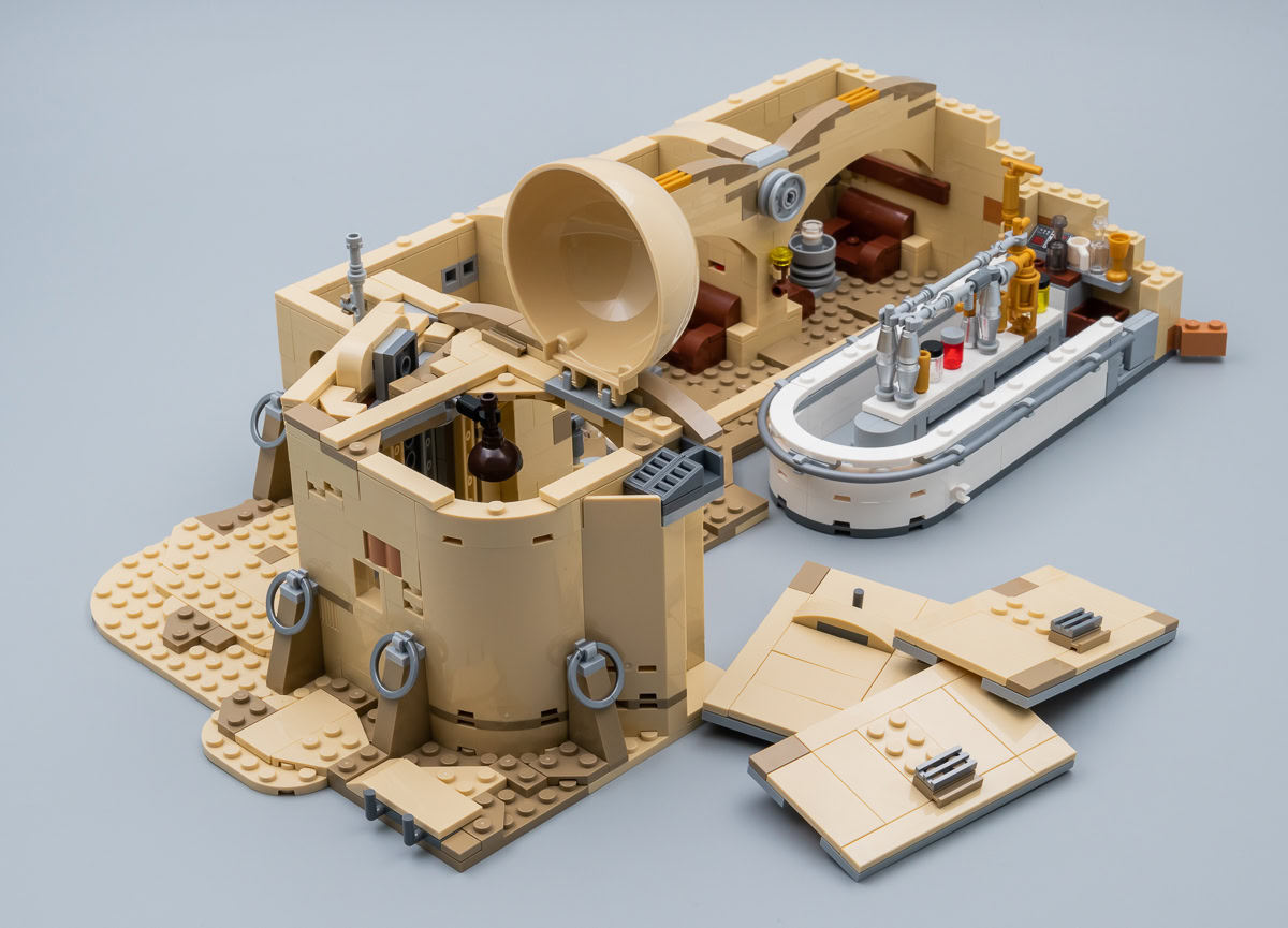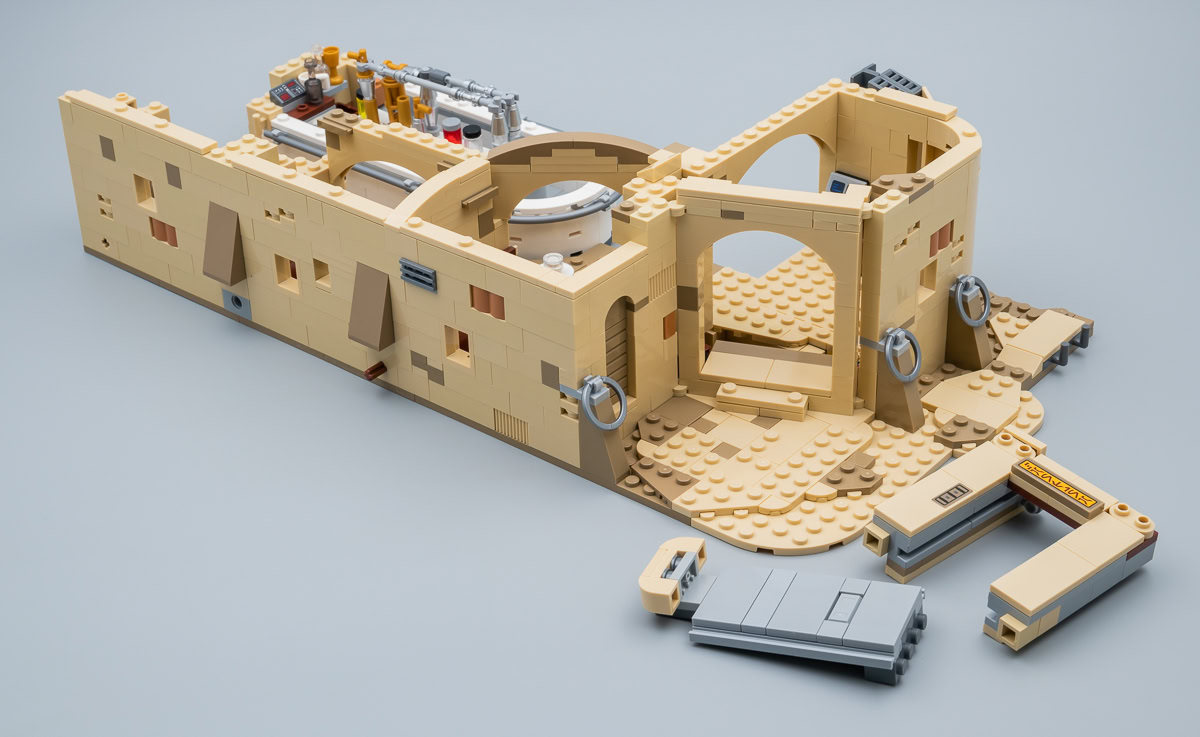 Les mauvaises langues trouveront que cette reproduction de la Cantina est à peu de choses près le résultat de l'assemblage de trois ou quatre exemplaires du playset beaucoup plus sommaire vu dans le set 75052 Mos Eisley Cantina commercialisé en 2014. Et ils n'auront pas totalement tort : on y retrouve les mêmes techniques d'assemblage jusque dans certains détails. Ne cherchez pas ici de prouesses en matière de design, le set est sur cet aspect du niveau des jouets habituels de la gamme LEGO Star Wars, le gigantisme et la modularité en plus.