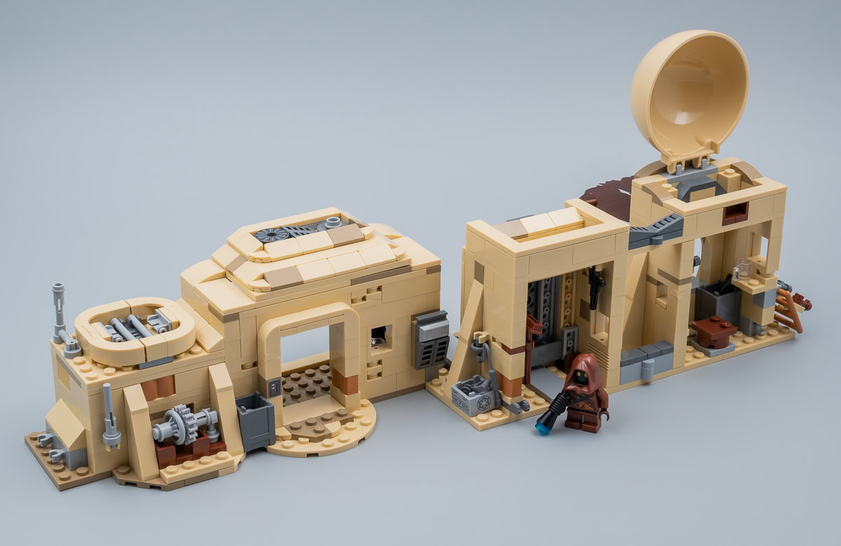 LEGO aurait aussi pu se contenter de nous vendre uniquement le bâtiment principal, mais les designers ont eu la bonne idée d'essayer de le mettre dans un contexte plus global en ajoutant quelques éléments piochés dans les rues de Mos Eisley : deux engins, une petite construction supplémentaire et quelques évaporateurs. à 350 €, il ne fallait pas s'attendre à un village entier et ce qu'on obtient ici est déjà un bon début.