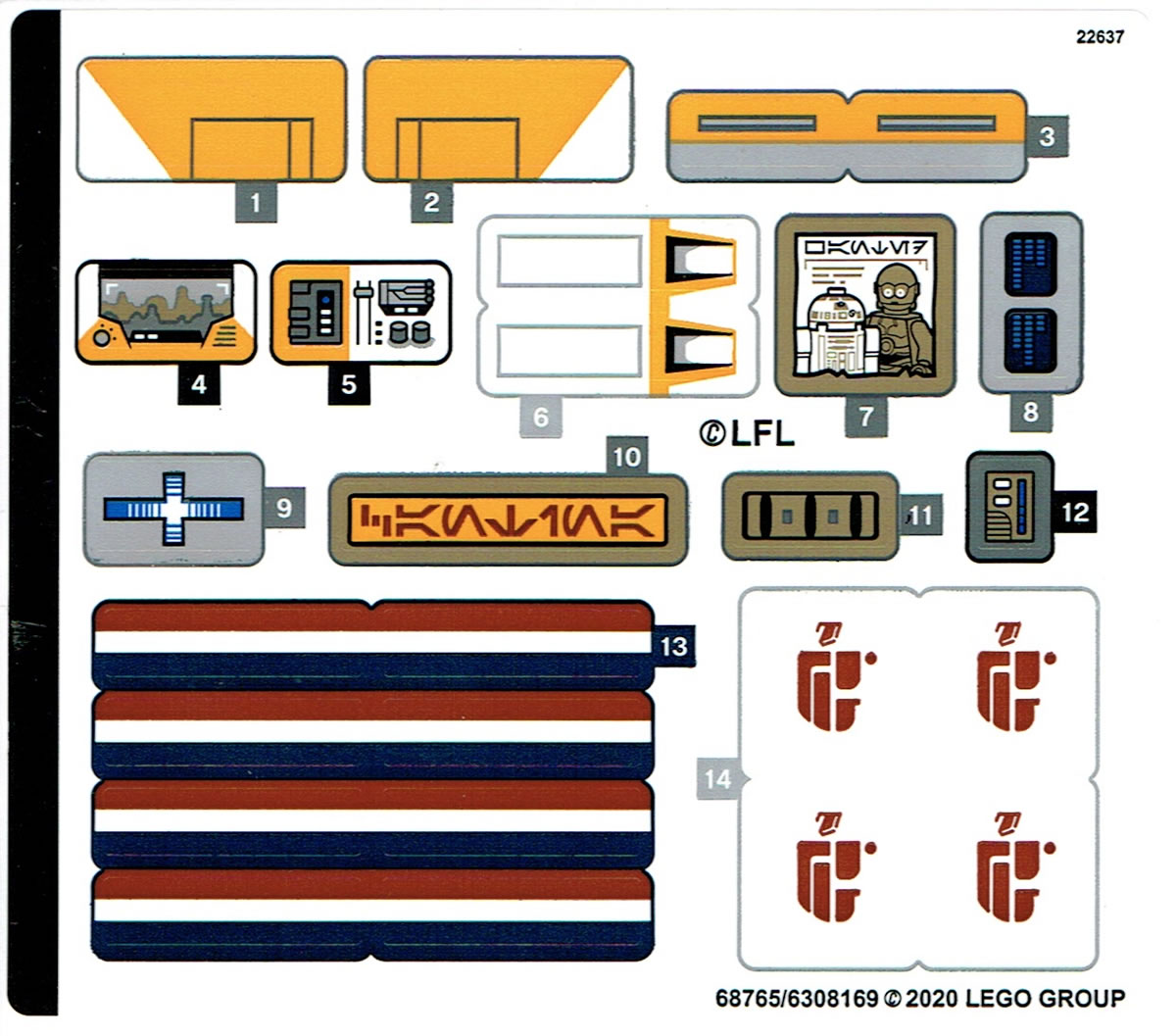 On n'échappe pas à la traditionnelle planche de stickers, mais le nombre d'autocollants à poser est plutôt raisonnable sachant que seulement cinq d'entre eux concernent la Cantina elle-même. L'intitulé "Master Builder Series" ne nous permet donc pas d'échapper à ces éléments "périssables" qui n'ont pourtant rien à faire sur un pur produit d'exposition. Les pièces tampographiées se font rares dans cette boite, mais on retiendra surtout la présence de trois jolies caisses grises tampographiées de la mention "CARGO" en Aurebesh (voir plus bas).