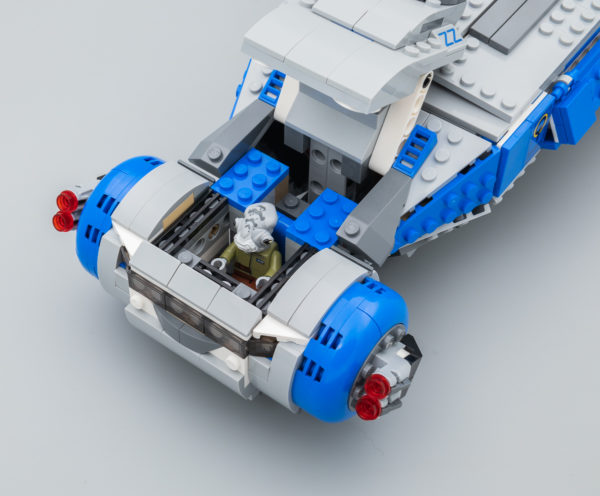 Pas de trains d'atterrissage sous la carlingue, mais le vaisseau reste légèrement surélevé et ne frotte pas sur le sol grâce aux quatre pièces placées aux extrémités. Le poste de pilotage, accessible en soulevant le couvercle mobile, est loin d'être suréquipé en écrans et autres manettes, il ne contient qu'un simple sticker mais laisse suffisamment d'espace pour y installer une ou deux figurines l'une derrière l'autre. La verrière est aveugle, il ne s'agit que de quelques pièces transparentes placées sur la face avant du vaisseau.