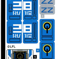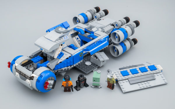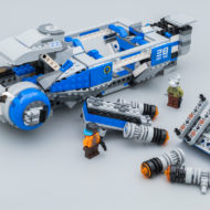 Au niveau de l'armement intégré, les designers n'ont pas été avares en Stud-Shooters avec pas moins de huit exemplaires placés par groupes de deux aux extrémités du vaisseau. La planche de stickers reste raisonnable et elle permet d'habiller ce transporteur aux couleurs de celui de l'attraction visibles dans les parcs Disney.