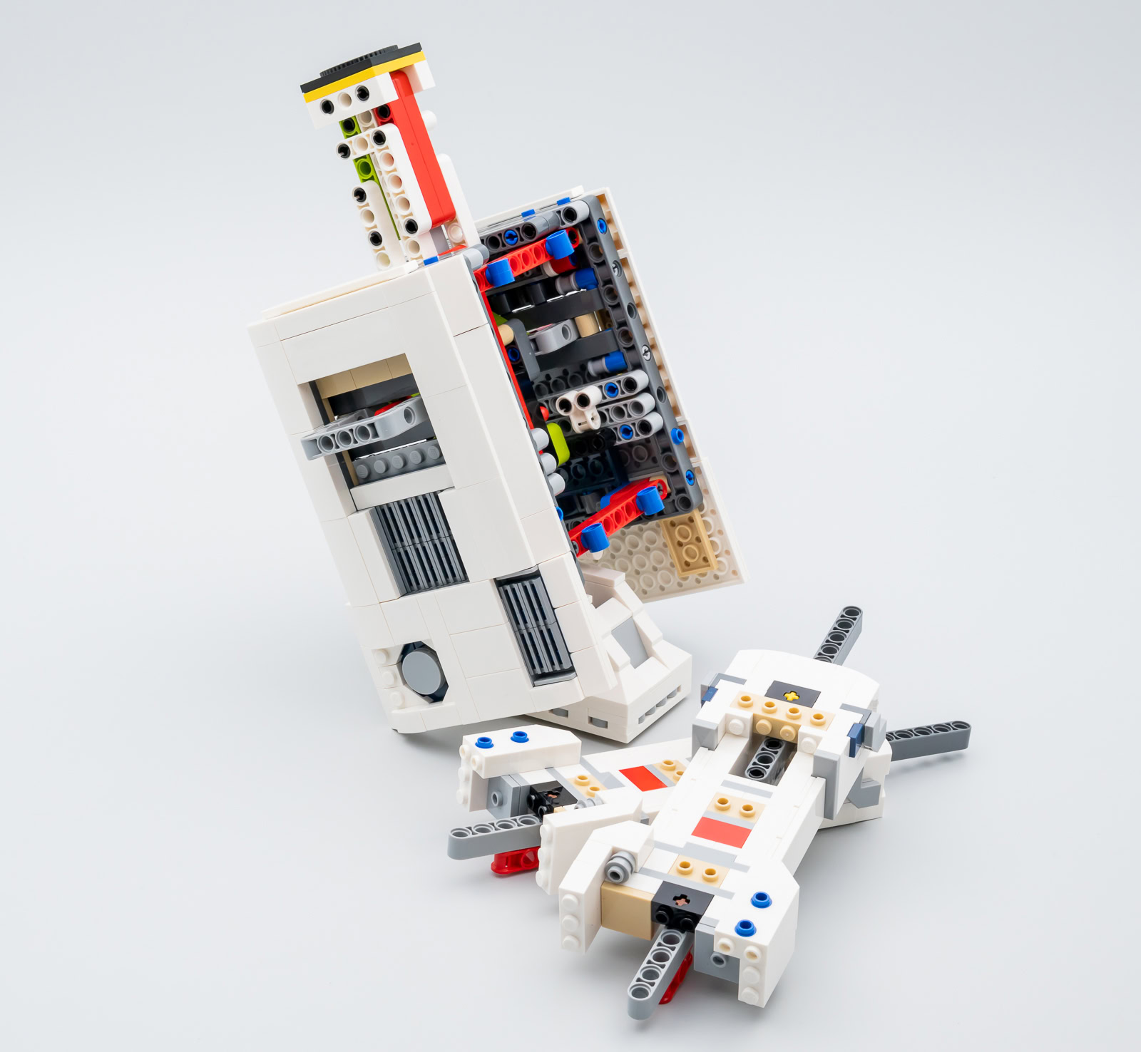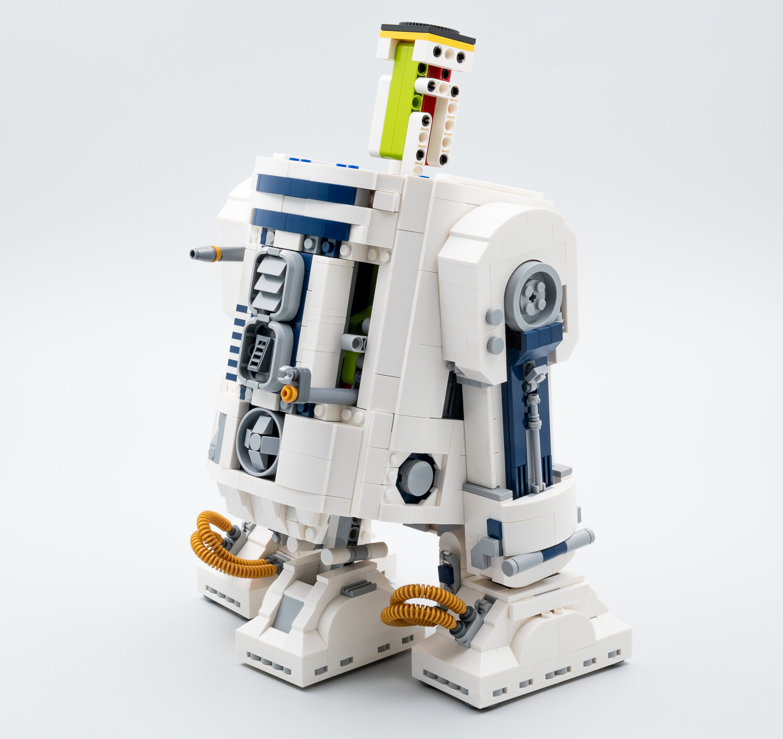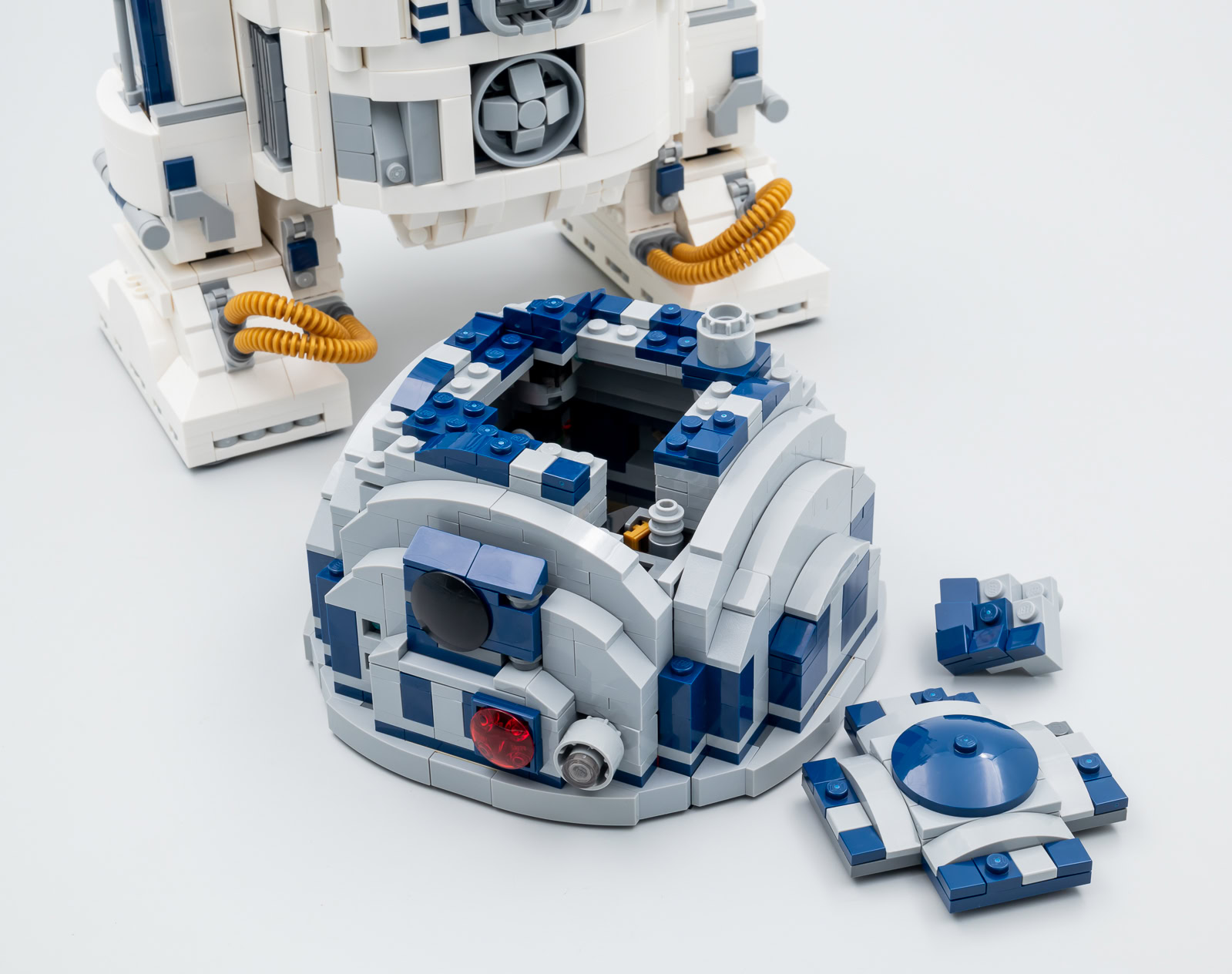 Si l'apparence extérieure du droïde de 31 cm de haut sur 20 cm de large ne semble que peu avoir évolué d'un modèle à l'autre, les techniques utilisées pour aboutir à ce résultat sont elles complètement différentes. Sur la version 2021, la structure interne se compose désormais d'un châssis à base d'éléments Technic encadrés par deux Frames 11x15 sur lequel on vient plaquer des sous-ensembles. La version 2012 se contentait d'un tube en briques empilées à l'intérieur duquel on glissait le mécanisme à crémaillère qui permettait de déployer le pied central.