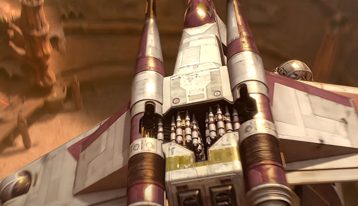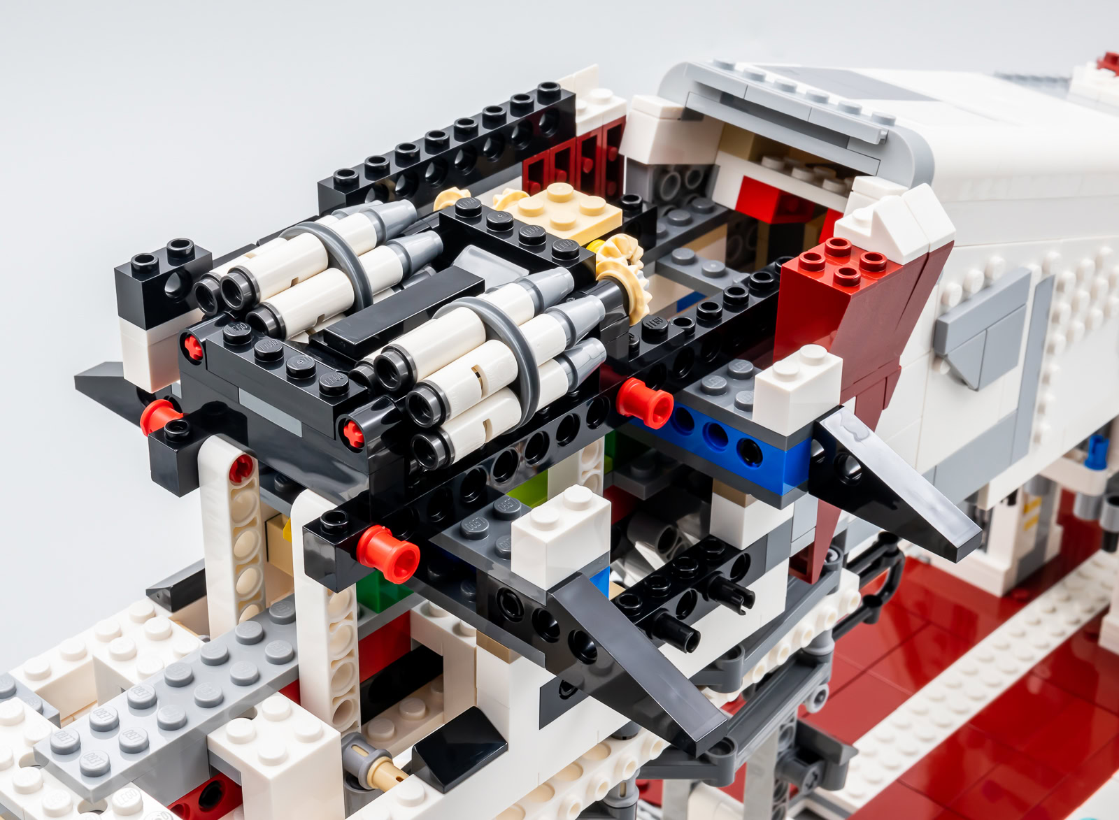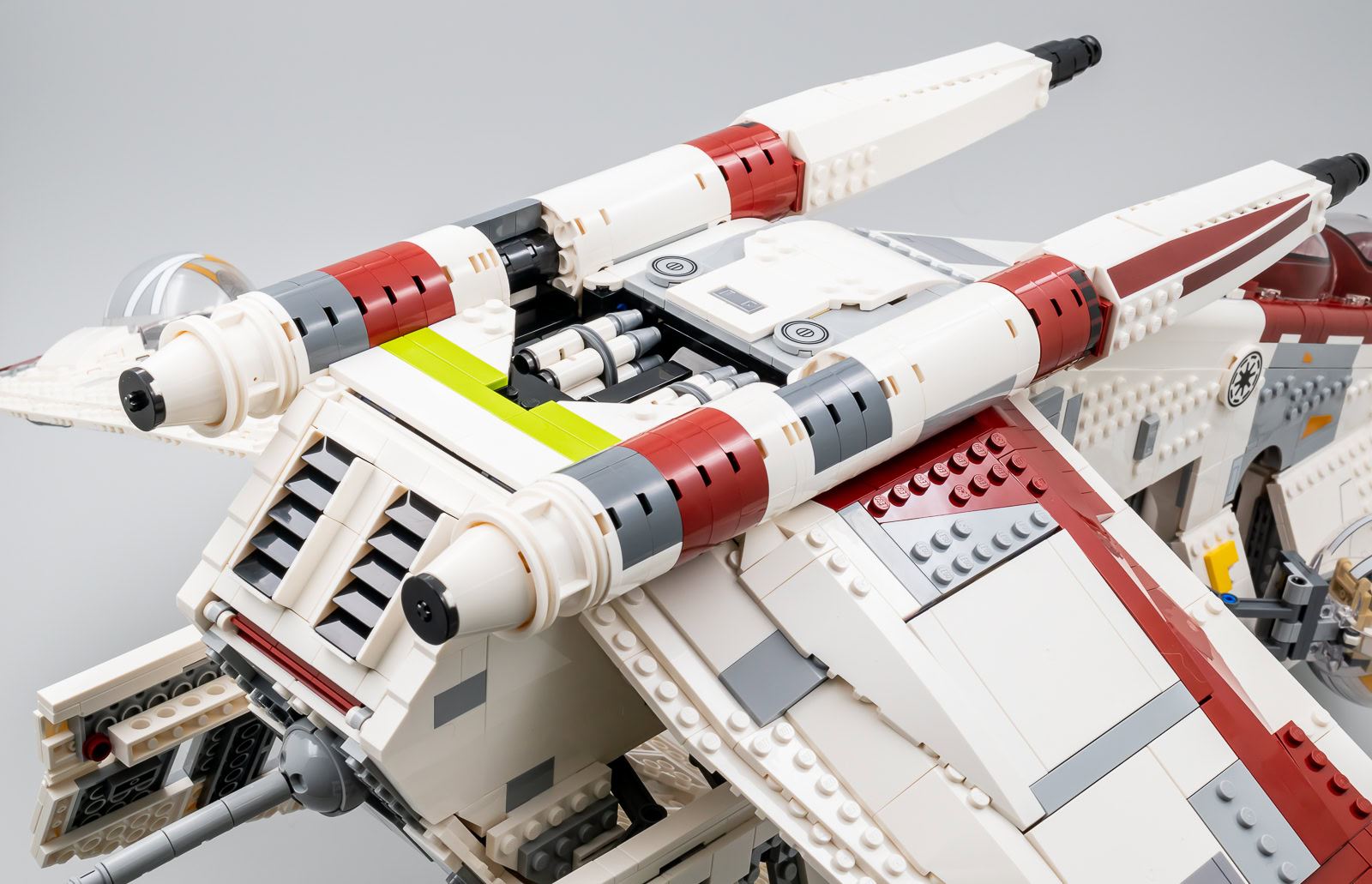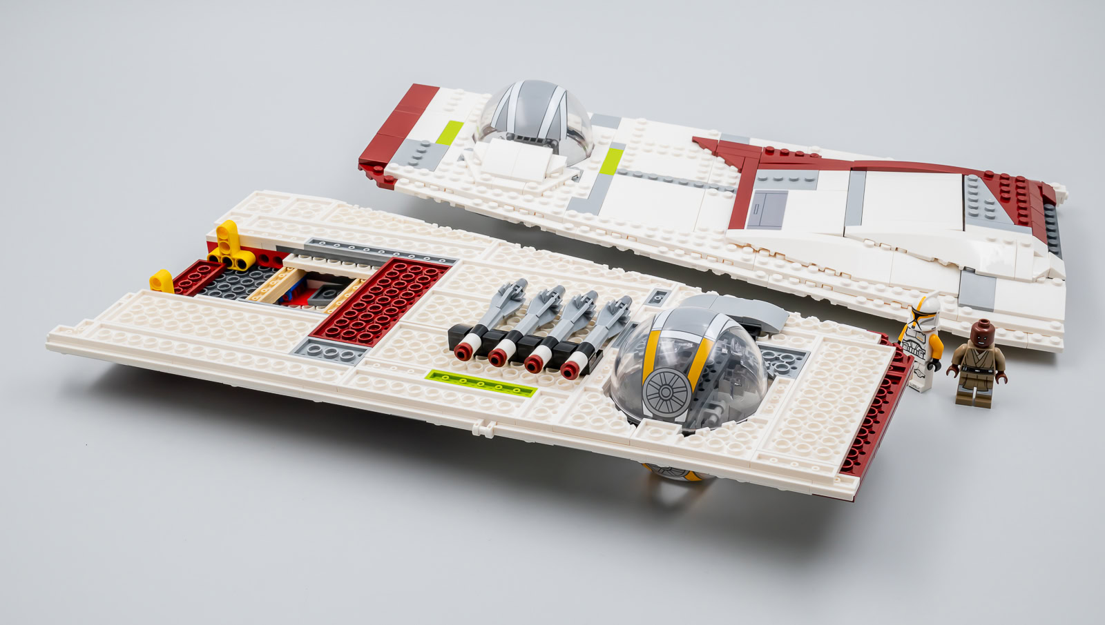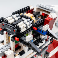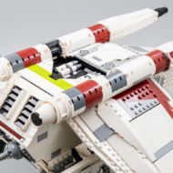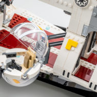 Les ailes sont lourdes, mais elles sont efficacement soutenues par les assemblages d'éléments Technic prévus pour qu'elles ne s'affaissent pas et l'empilement de plaques leur assure une rigidité maximale. Les deux ailes prennent un peu de volume au niveau de la jonction avec le corps du vaisseau, on évite les structures trop plates et un peu fades souvent présentes sur les modèles au format System. L'ensemble de l'armement habituellement embarqué par ces vaisseaux est présent avec des roquettes placées sous les ailes et à l'intérieur des deux portes latérales et deux rouleaux de missiles, rotatifs via quelques engrenages, intégrés entre les moteurs.