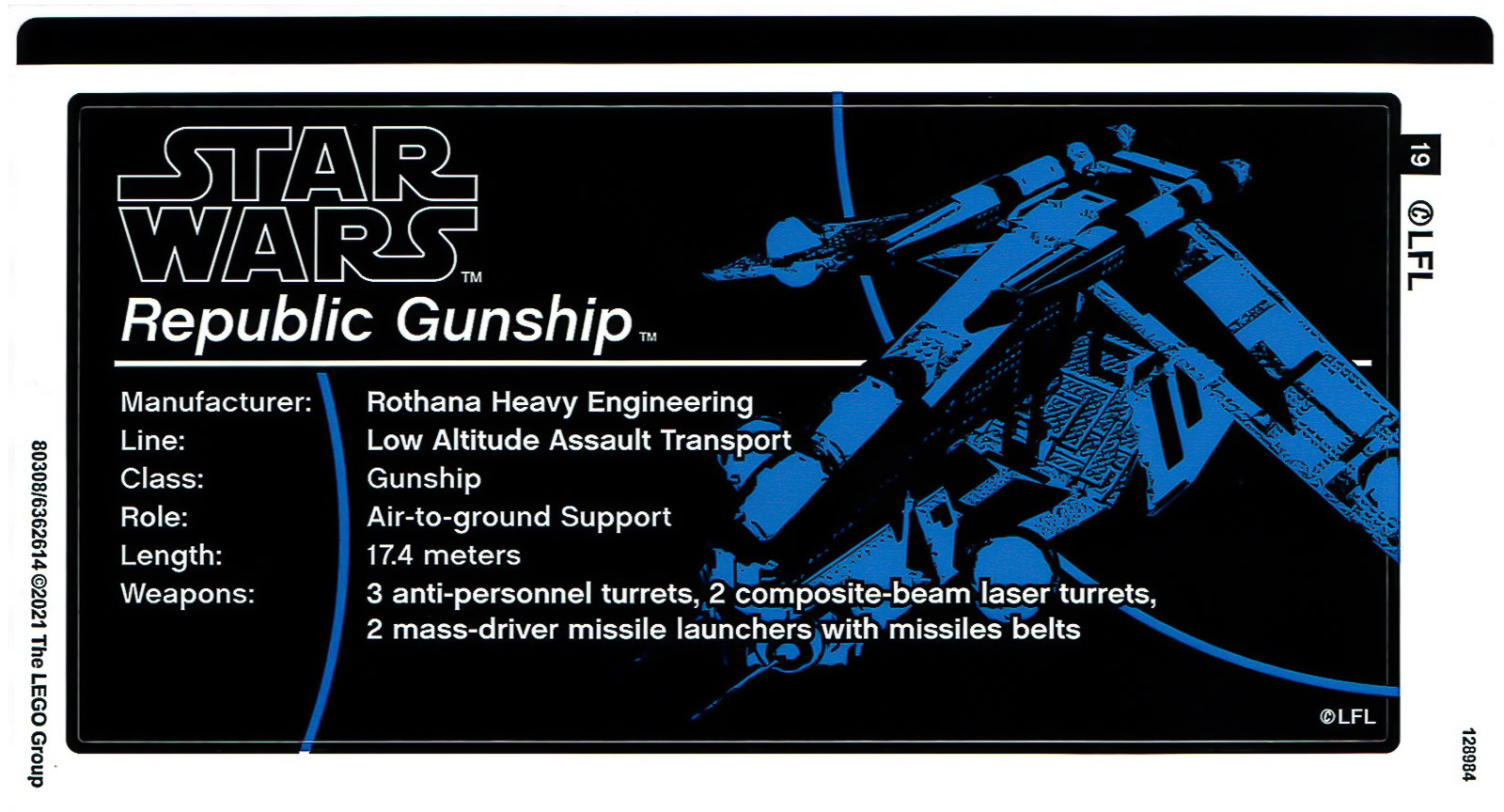 La planche de stickers est d'ailleurs un peu mesquine pour un produit haut de gamme à 350 €, sachant qu'elle se contente majoritairement d'autocollants sur fond transparent ajoutant quelques détails visuels à la coque et de deux symboles de la République Galactique qui eux sont conformes à la différence de ceux présents sur la boite et sur le livret d'instructions. L'autre autocollant fourni est celui qui distille quelques facts sur le vaisseau avec une erreur sur la longueur de la chose : Starwars.com donne 17.69 m, LEGO écrit 17.4 m.