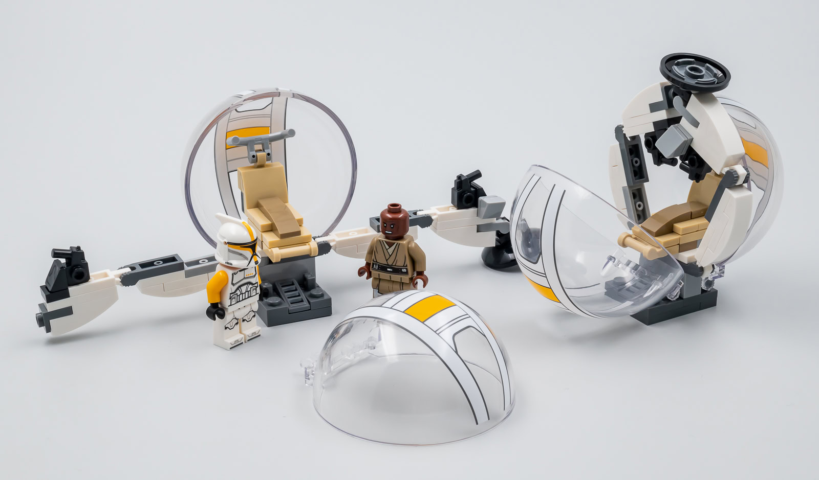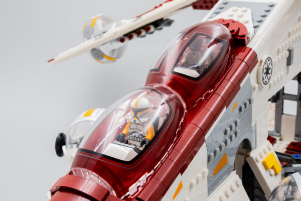 L'échelle du vaisseau est déterminée par les deux bulles qui servent de verrières et le reste est construit autour. Ce Gunship n'est évidemment pas à l'échelle minifig, même si on peut installer Mace Windu et le Clone Trooper Commander sur les deux sièges qui paraissent presque à l'échelle et qui me semblent donc un peu sous-dimensionnés par rapport au reste du vaisseau.