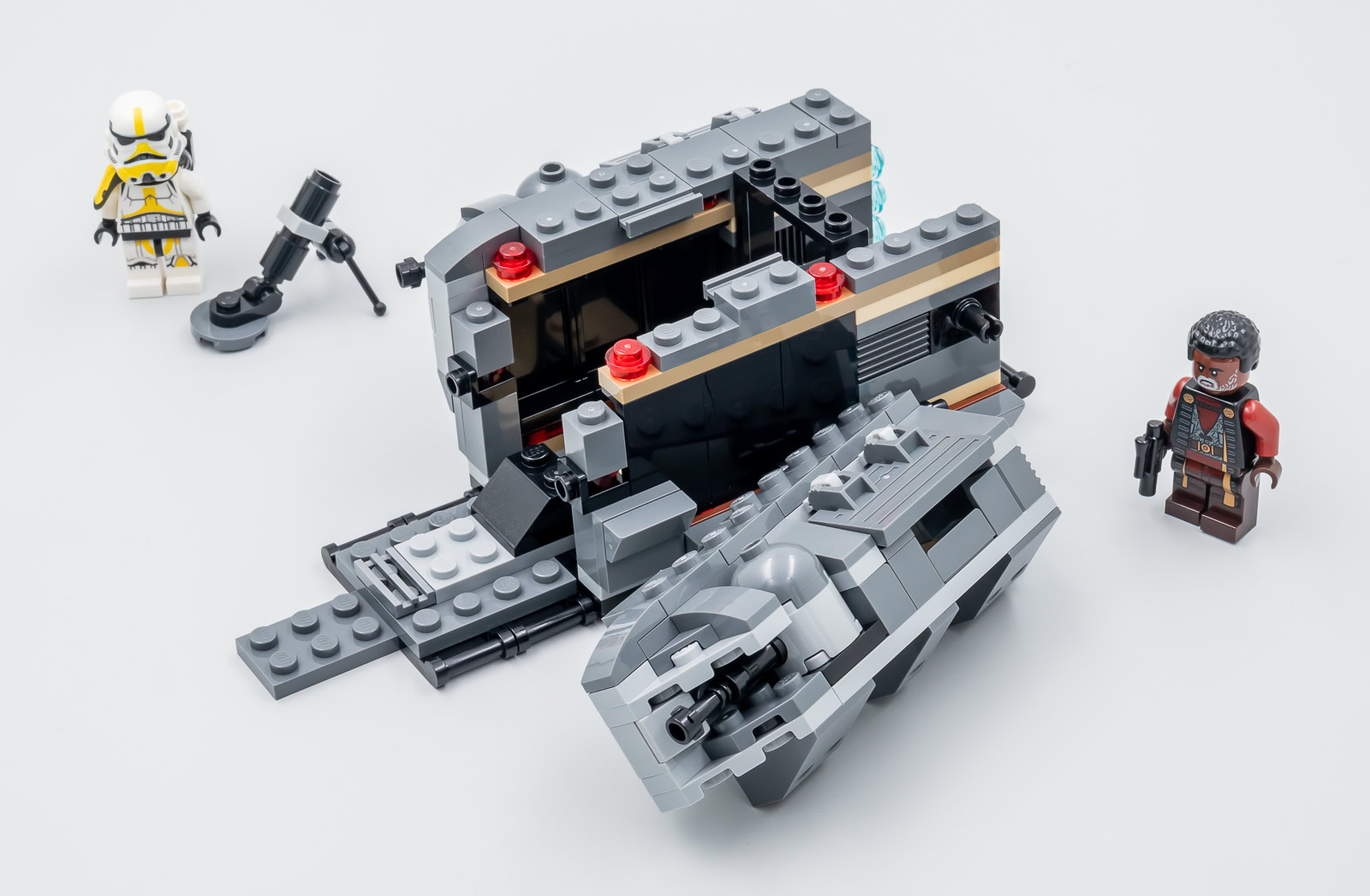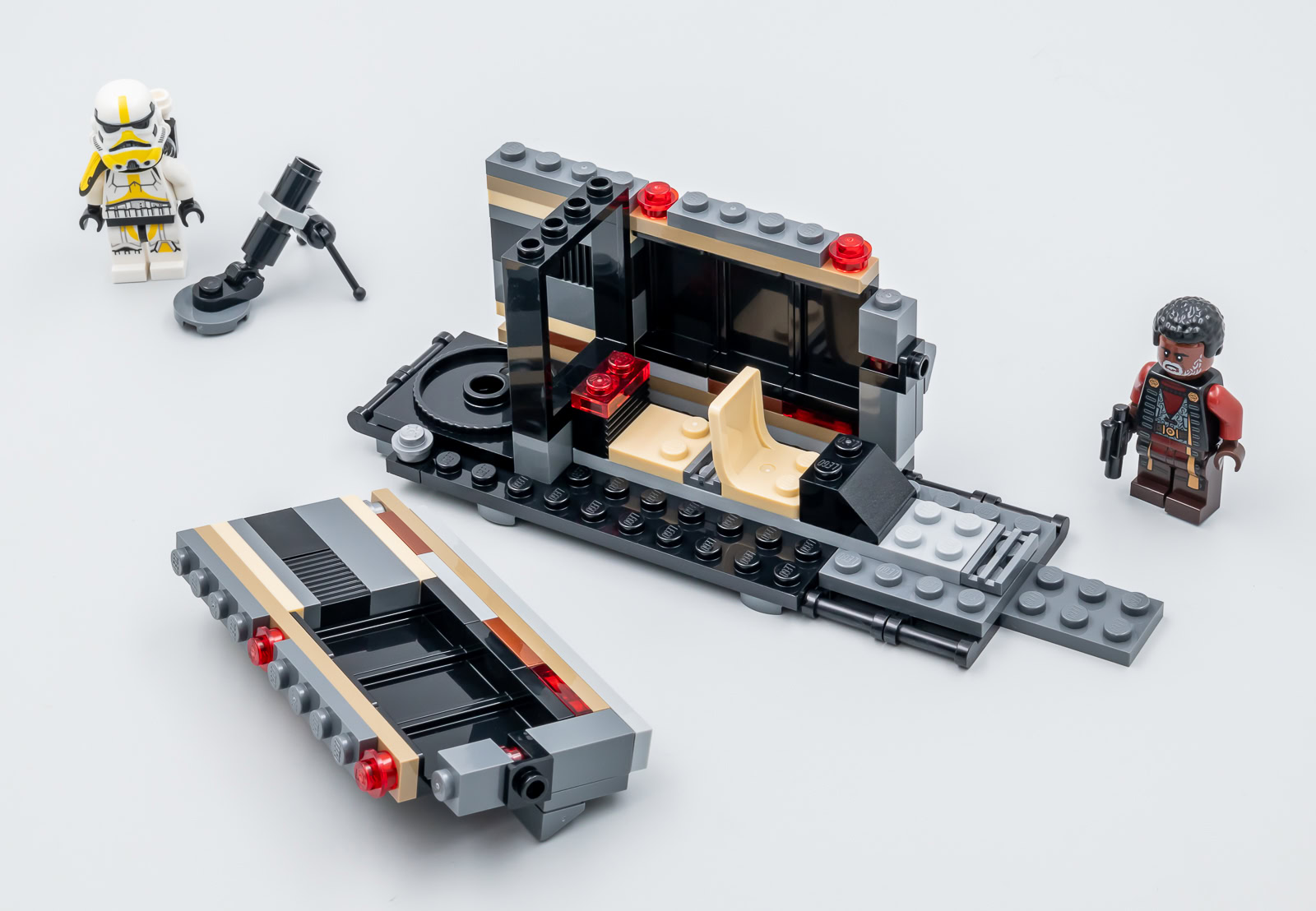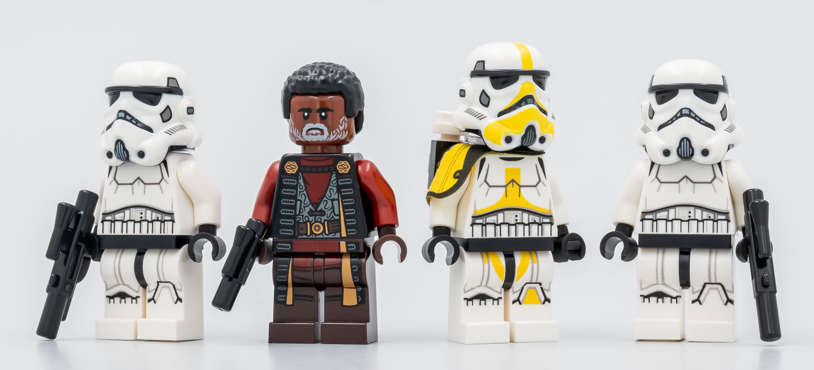 Le Mortar (ou Artillery) Stormtrooper n'apparait pour la première fois à l'écran que dans le chapitre 14 (The Tragedy) de la série, on peut donc se demander ce qu'il fait ici. Il aurait pu être remplacé par un Scout Trooper sur son Speeder Bike pour pouvoir vraiment reproduire la poursuite vue à l'écran et la minifig fournie ici aurait d'ailleurs été plus utile dans le set 75312 Boba Fett's Starship.