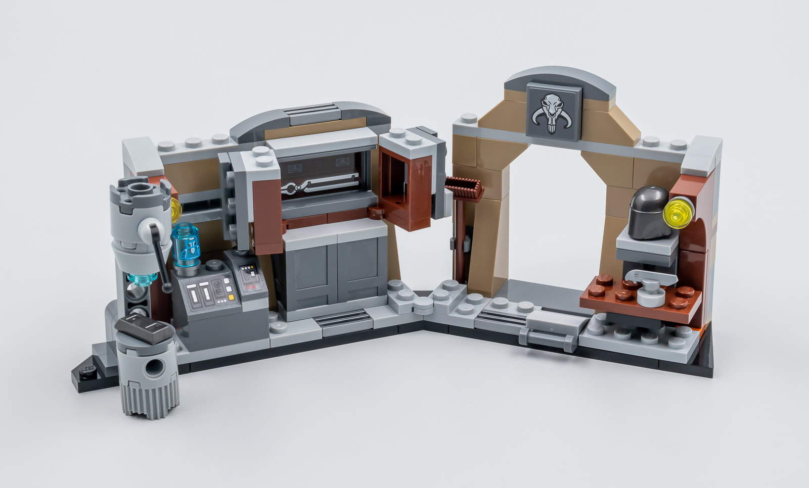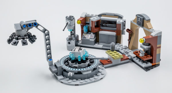 On retrouve bien les éléments vus à l'écran avec le foyer central, l'enclume qui permet de travailler le Beskar et deux bouts de murs qui tentent de recréer l'ambiance de la forge. C'est minimaliste mais il était de toute façon illusoire d'imaginer un espace entièrement fermé. Dommage pour les trois lingots qui incarne les blocs de Beskar, un élément tampographié ou même un simple sticker à coller sur une Tile aurait été apprécié, surtout dans un set dont l'action ne tourne qu'autour de la fonte et du travail de ce métal précieux.