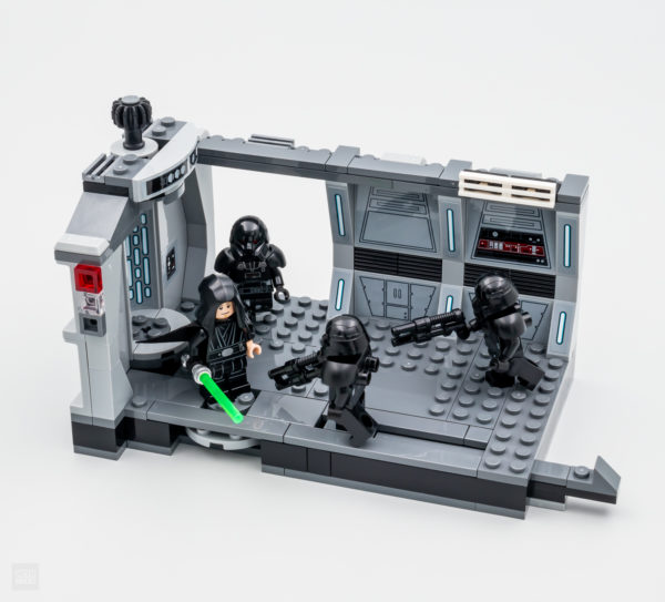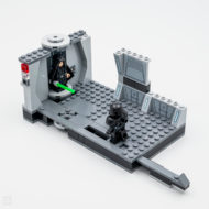 Le revenant affronte donc trois Dark Troopers qui meublent le morceau de couloir joliment habillé d'une quinzaine de stickers très fidèles sans lesquels la scène serait un peu pâle. Un autocollant pour onze pièces à assembler, c'est quand même beaucoup. Les droïdes sont au nombre de dix à l'écran, il vous faudra plusieurs boites pour obtenir une reproduction moins symbolique. Le tout pourra finir sagement sa carrière sur le coin d'une étagère, sauf si vous comptez sur cette boite pour récupérer les trois Dark Troopers qu'elle contient et les installer dans le croiseur du set 75315 Imperial Light Cruiser (159.99 €) qui n'en fournit qu'un exemplaire.