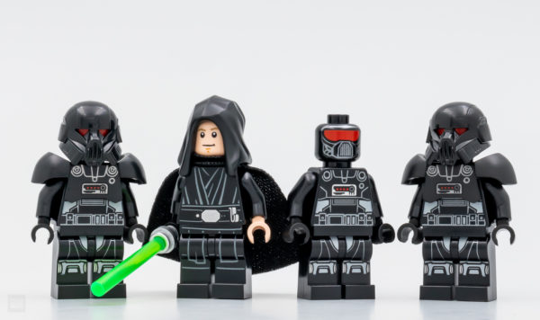 La minifig de Luke Skywalker est inédite des épaules au bout des pieds : le torse et les jambes de la figurine sont flanqués d'une nouvelle tampographie et la tête du personnage est celle utilisée à plusieurs reprises depuis 2015. La capuche noire anguleuse n'est pas inédite, c'est celle d'Ap'lek (Knights of Ren) en 2019, de Palpatine (2020), de Garindan (2020) ou encore du Bone Spirit de la gamme Monkie Kid en 2021. La minifig est réussie, difficile de rendre plus sexy une tenue relativement sobre. Certains trouveront peut-être le crochet placé au bas du torse de Luke Skywalker un peu trop gros, mais c'est avec la boucle de la ceinture le seul détail significatif d'un torse qui se contente de quelques lignes grises.