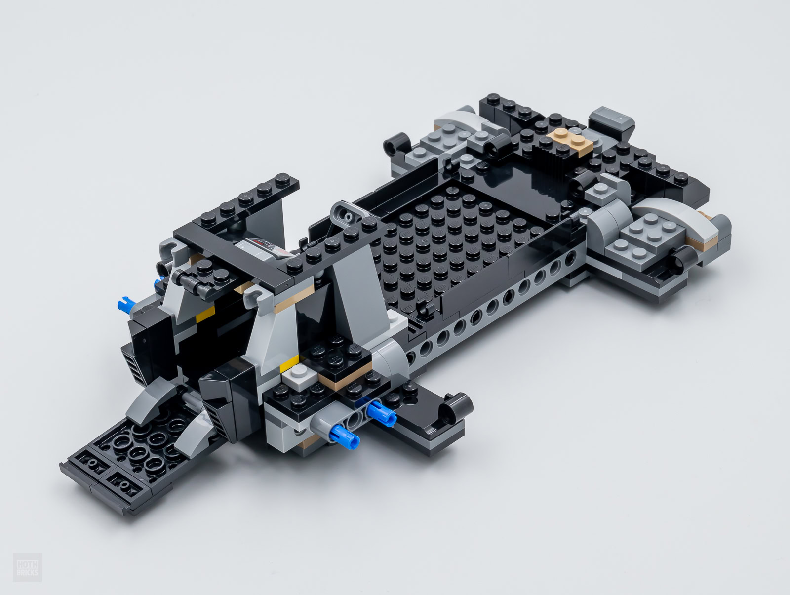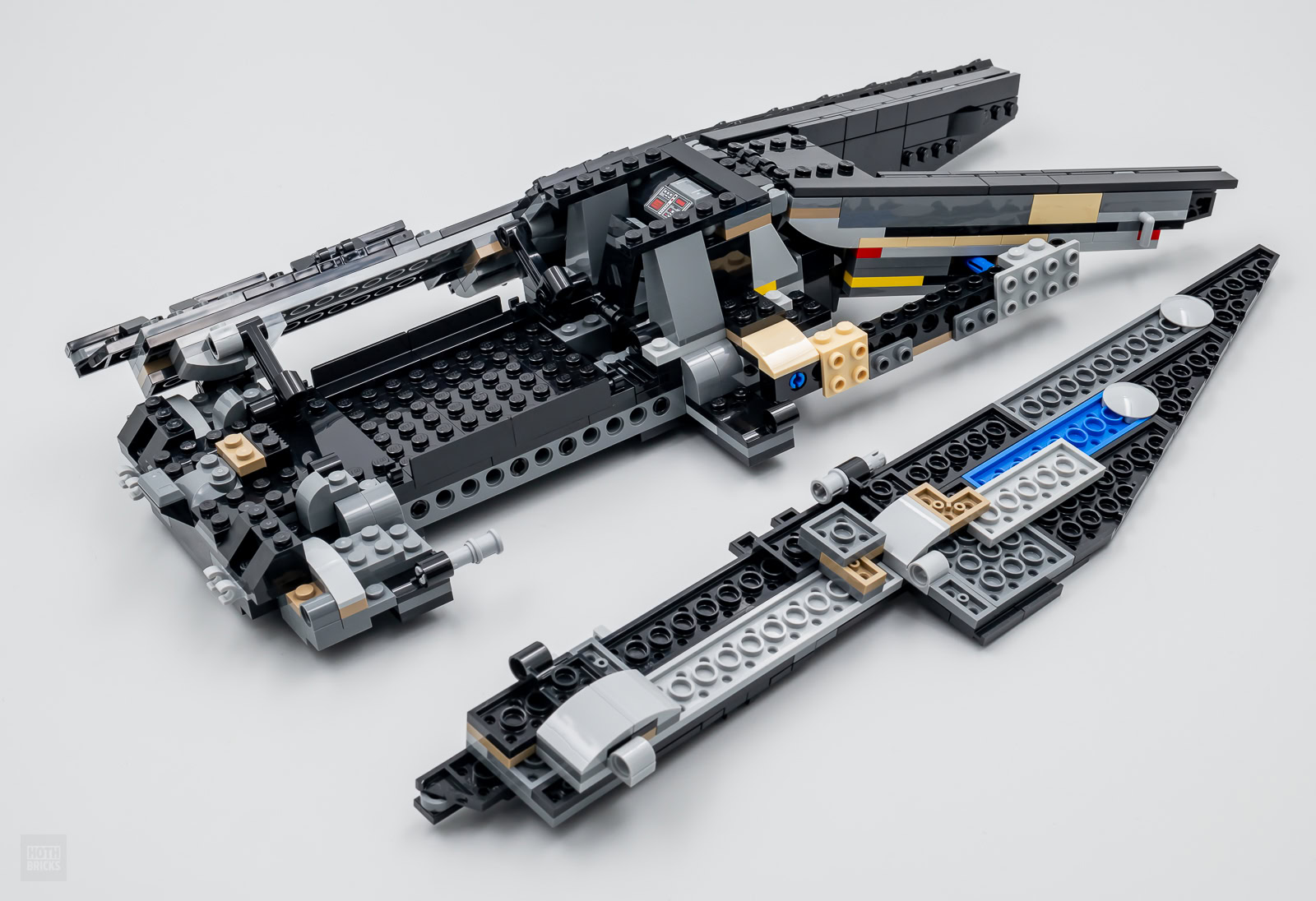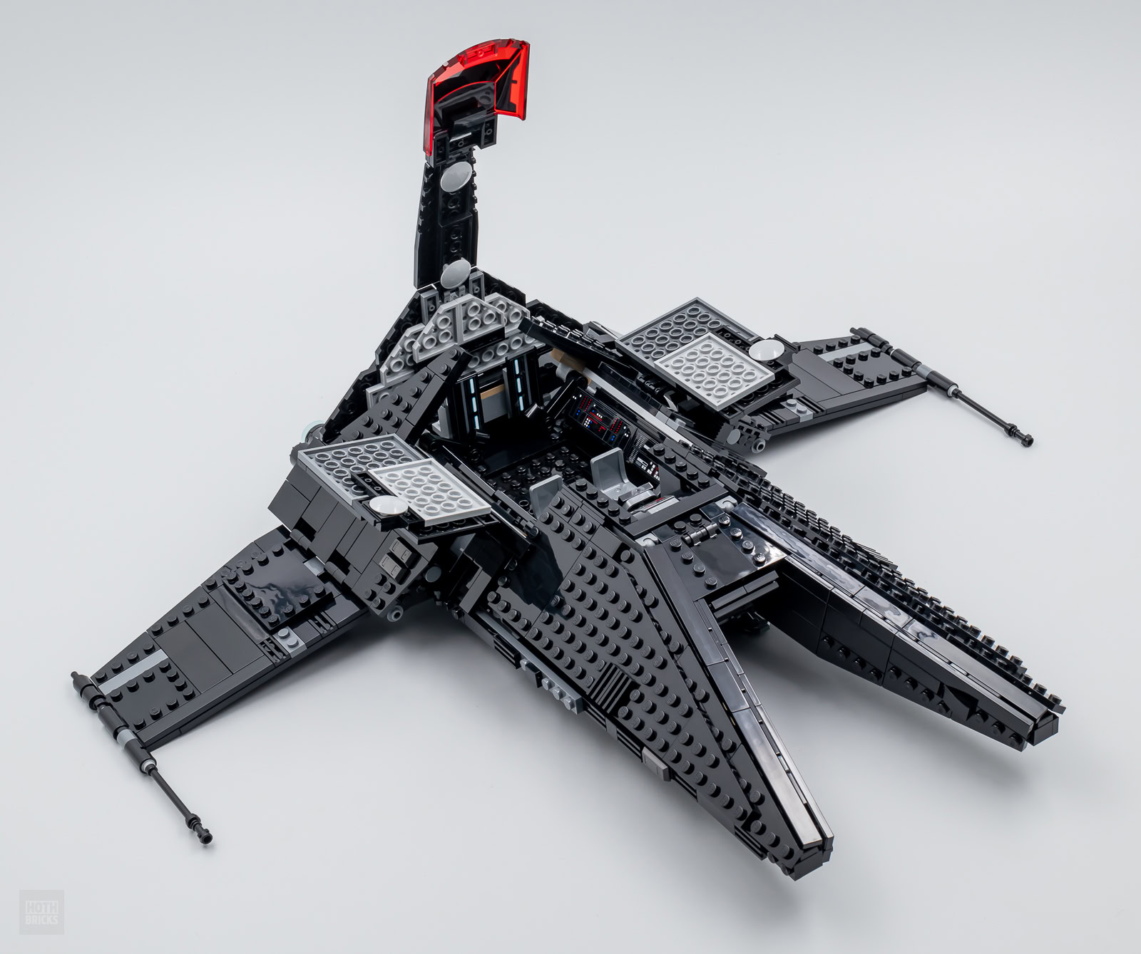 Ce vaisseau de 37 cm de long sur 24 cm de large et 14 cm de haut n'est évidemment pas à l'échelle des minifigs et il joue comme souvent sur une double échelle avec un intérieur adapté aux séances de jeu avec des minifigs et une envergure extérieure qui en fait une maquette compacte mais très correcte. LEGO ajoute des trains d'atterrissage sous le vaisseau, il ne repose donc pas directement sur le sol et c'est appréciable.