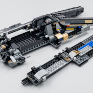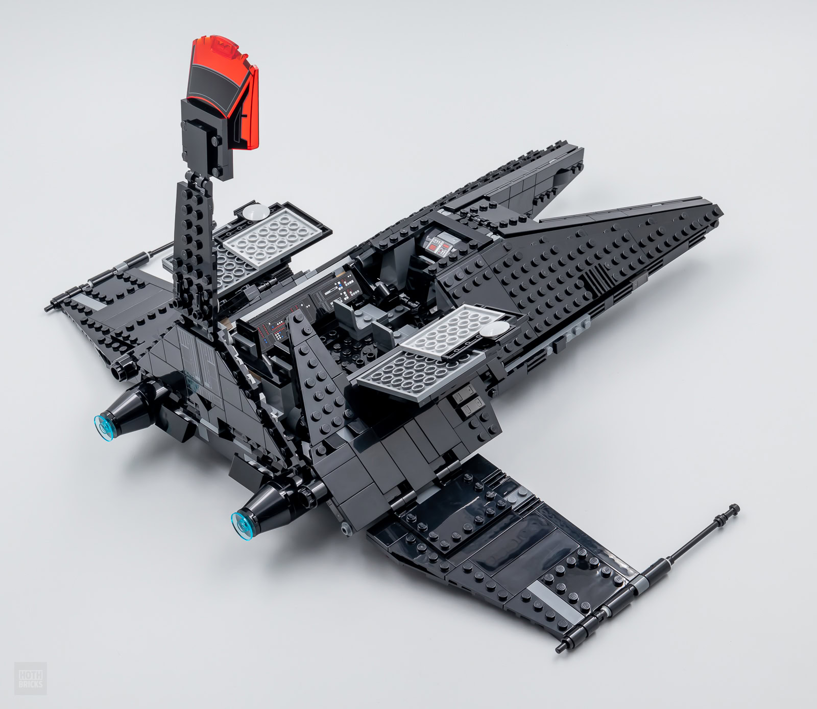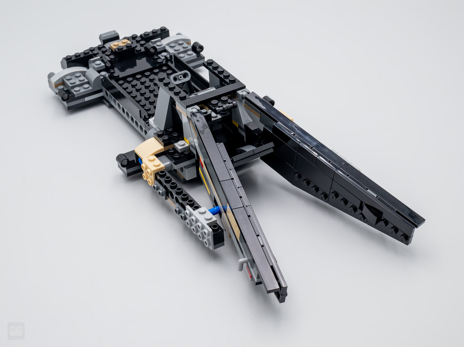 L'espace intérieur est facilement accessible et il y a de la place pour y mettre en scène les trois inquisiteurs. Une poignée de stickers vient donner de la consistance au poste de pilotage un peu vide avec seulement trois sièges et le tout est fermé par un pare-brise de voiture rouge joliment tampographié. LEGO ajoute deux Spring-Shooters sous les ailes, ils sont bien intégrés mais ils peuvent comme d'habitude être facilement retirés si le produit a vocation à finir sa carrière sur vos étagères comme un simple maquette d'exposition.