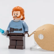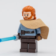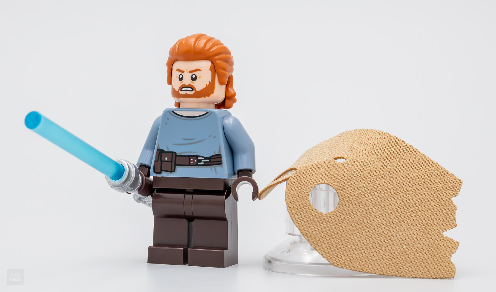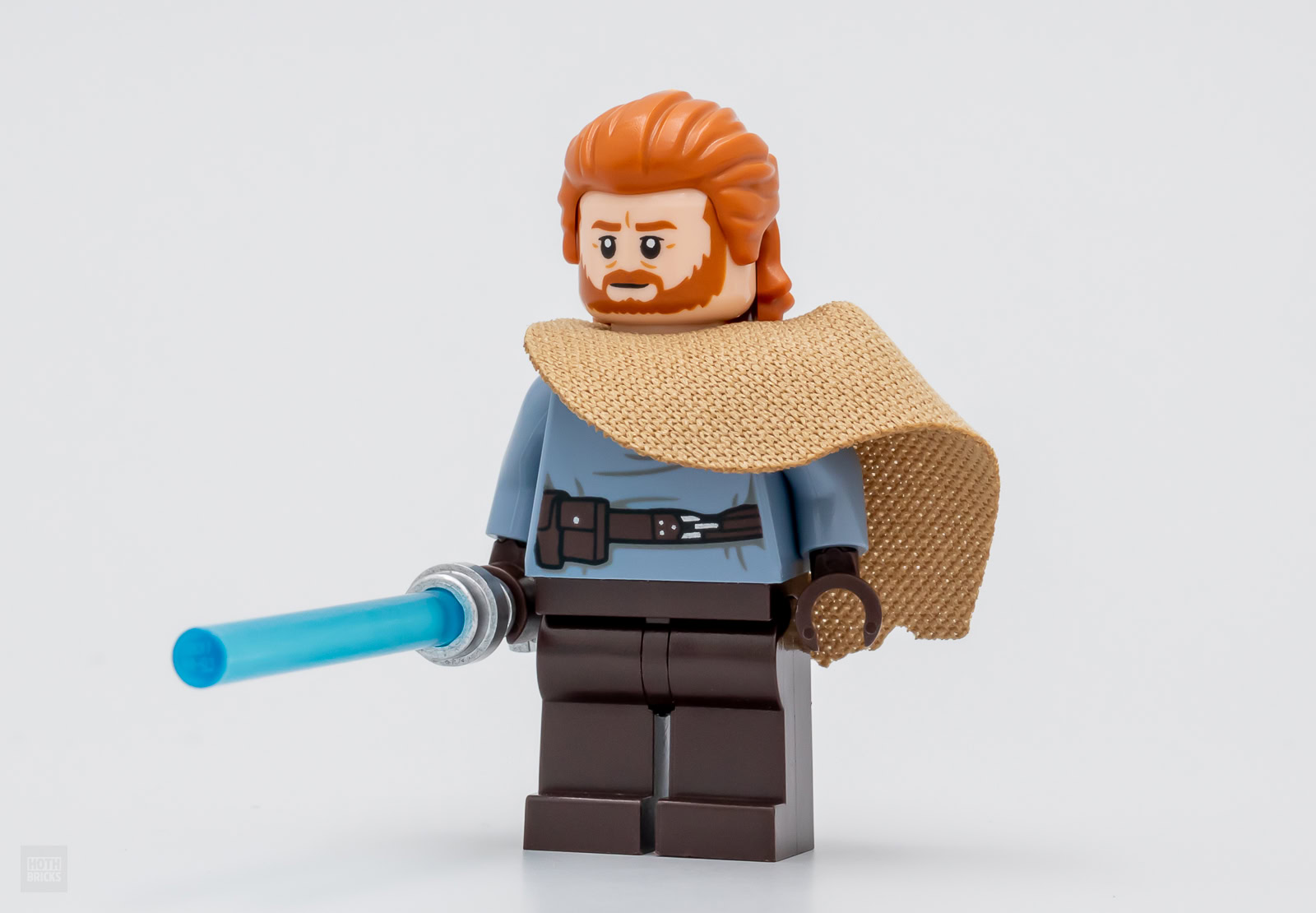 La minifig d'Obi-Wan est de son côté globalement fidèle à la version du personnage vue à l'écran. J'ai un peu de mal avec la coupe mulet orange mais le reste est acceptable. Le bout de tissu qui se glisse sur les épaules de la figurine fait illusion et il nous rend service : il dissimule l'écart de teinte entre la tête du personnage et la zone du cou qui aurait du être de couleur chair. Jambes neutres pour Obi-Wan, ça coûte un peu moins cher à LEGO.