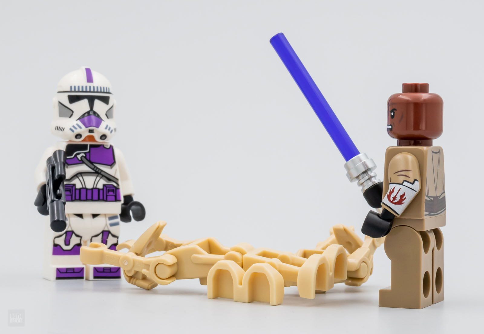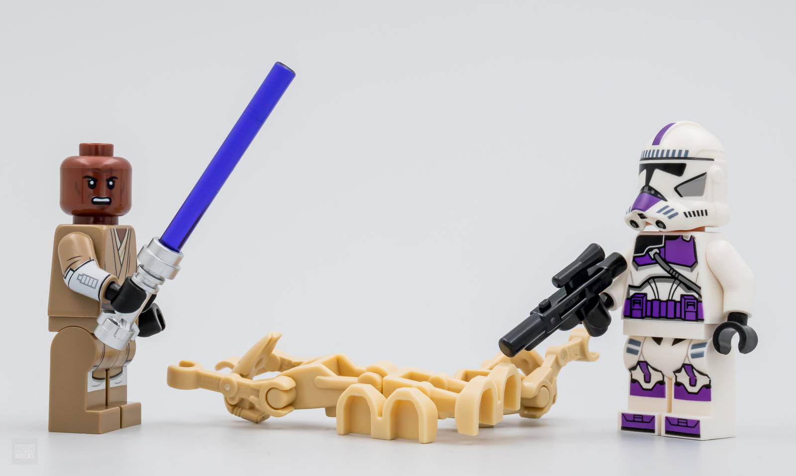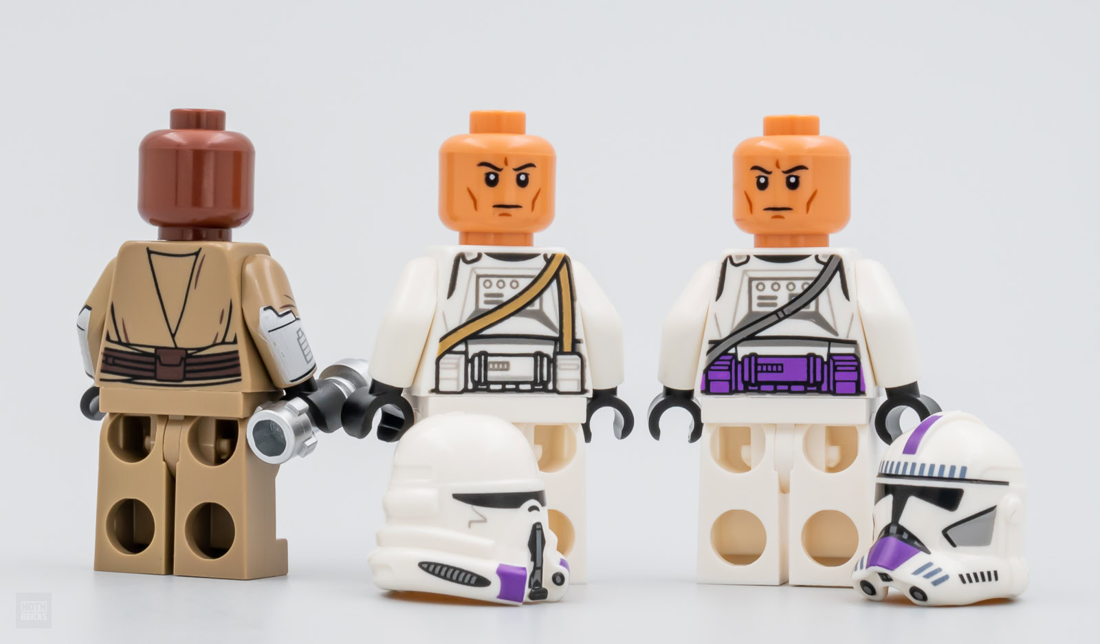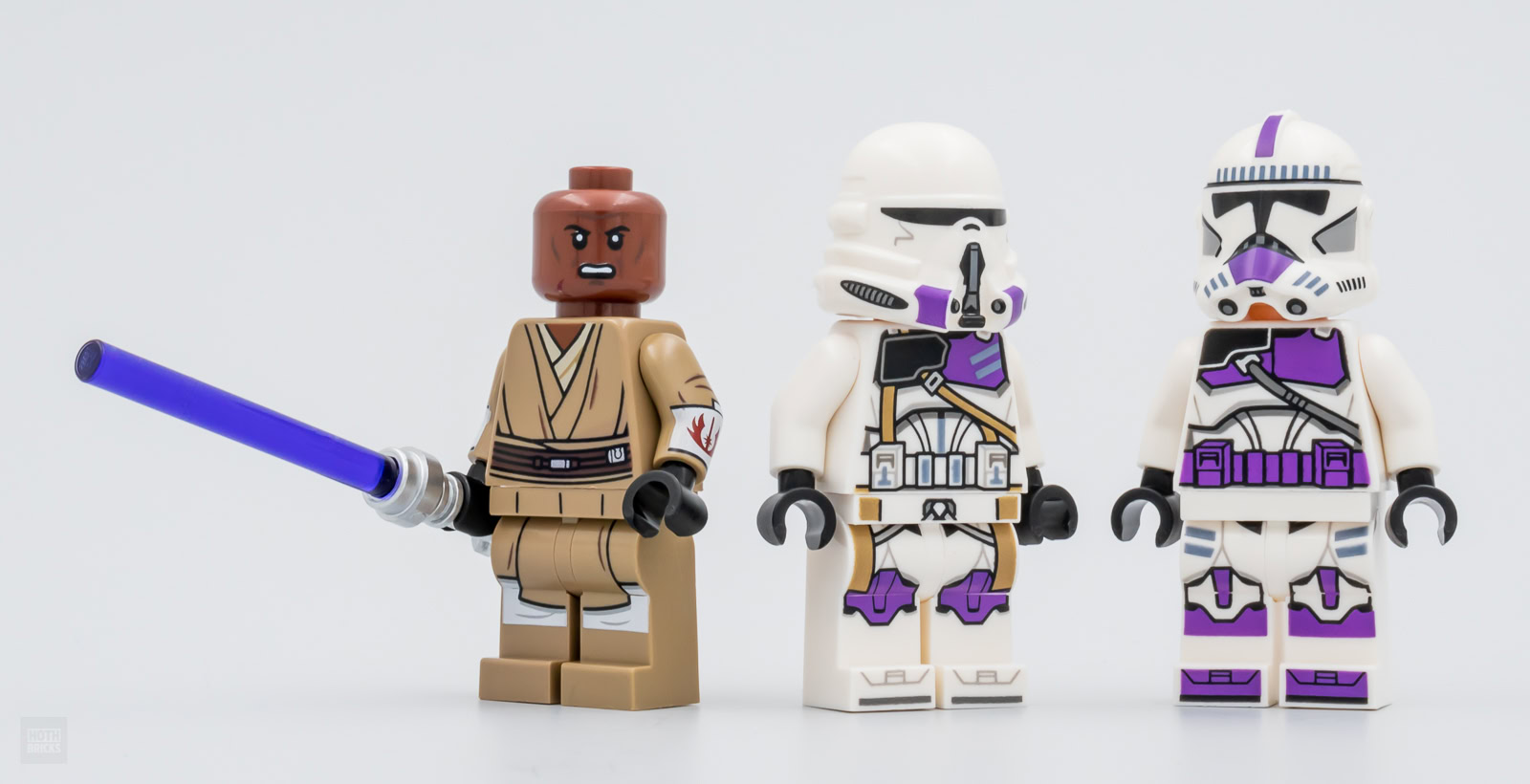 Les vraies stars du produit sont évidemment les minifigs fournies : on obtient une version inédite de Mace Windu et trois Clone Troopers de la fameuse 187ème Légion livrés ici dans un coloris raccord avec celui de la lame du sabre de Windu. Ceux qui ont connu le "Battle Pack" commercialisé par Hasbro en 2007 apprécieront de voir que LEGO y va cette année de son adaptation de cette escouade, les autres trouveront probablement ces minifigs colorées à la tampographie très aboutie trop cools pour faire l'impasse.
