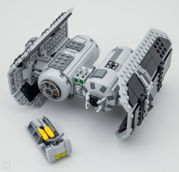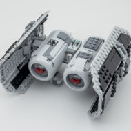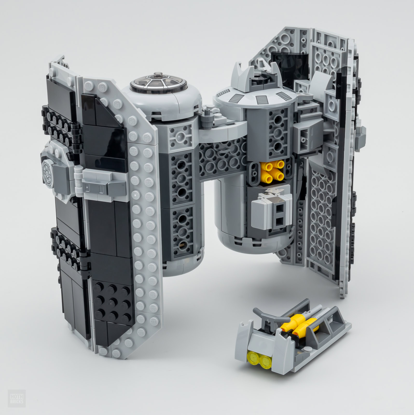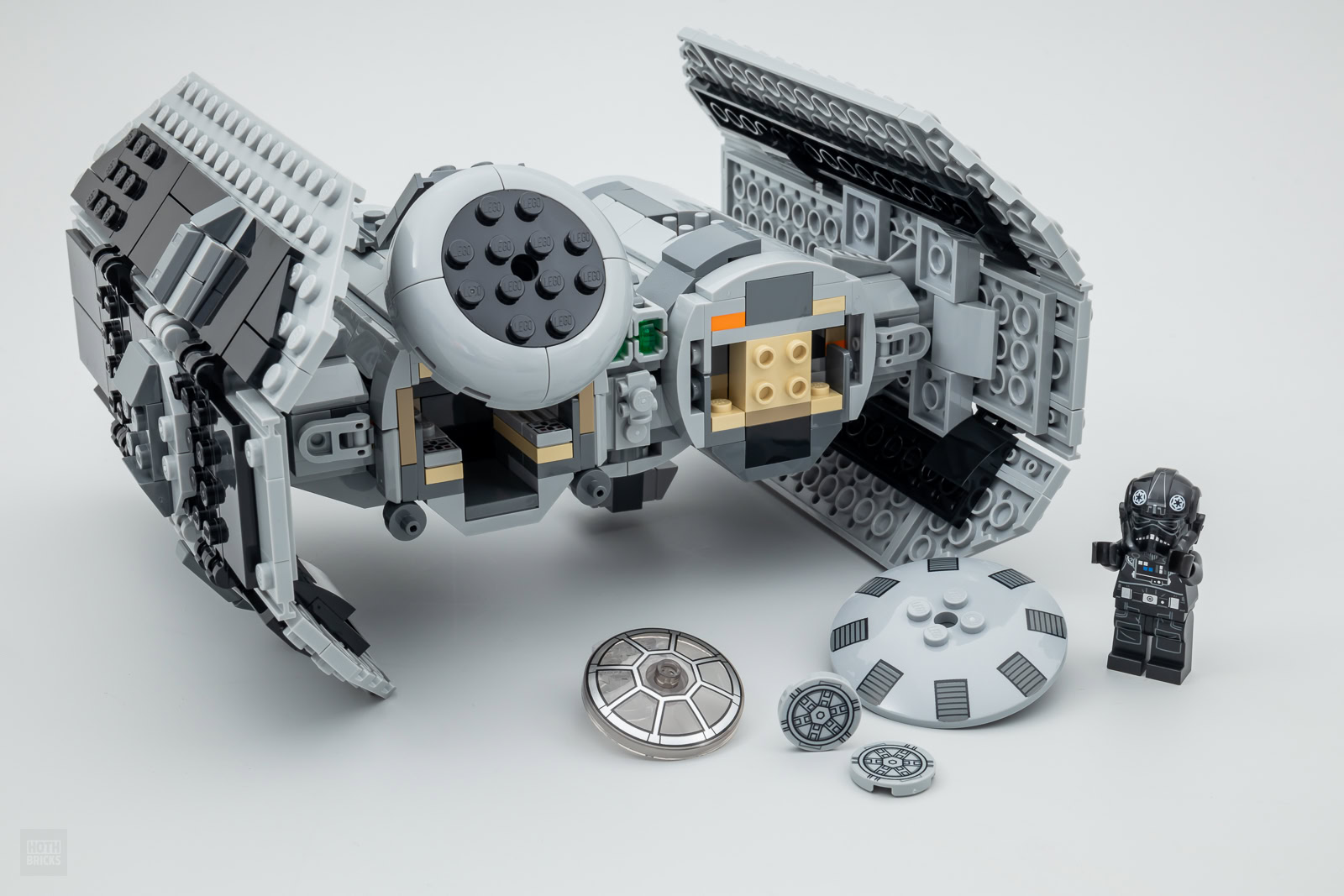 N'essayez pas de deviner la présence du pilote aux commandes du vaisseau à travers la verrière du poste de pilotage, cette dernière n'est que décorative et elle est enfichée sur un fond noir. Même constat de l'autre côté du vaisseau avec un Dish tampographié qui dissimule simplement la structure interne et ne propose qu'une ouverture suggérée. Il manque peut-être un petit support pour pouvoir exposer convenablement ce vaisseau entre deux séances de jeu, il suffisait de quelques poutres Technic et le tout rentrait largement dans les 65 € demandés sans gréver la marge du fabricant. En l'état, le Tie Bomber reposera sur ses ailes.
