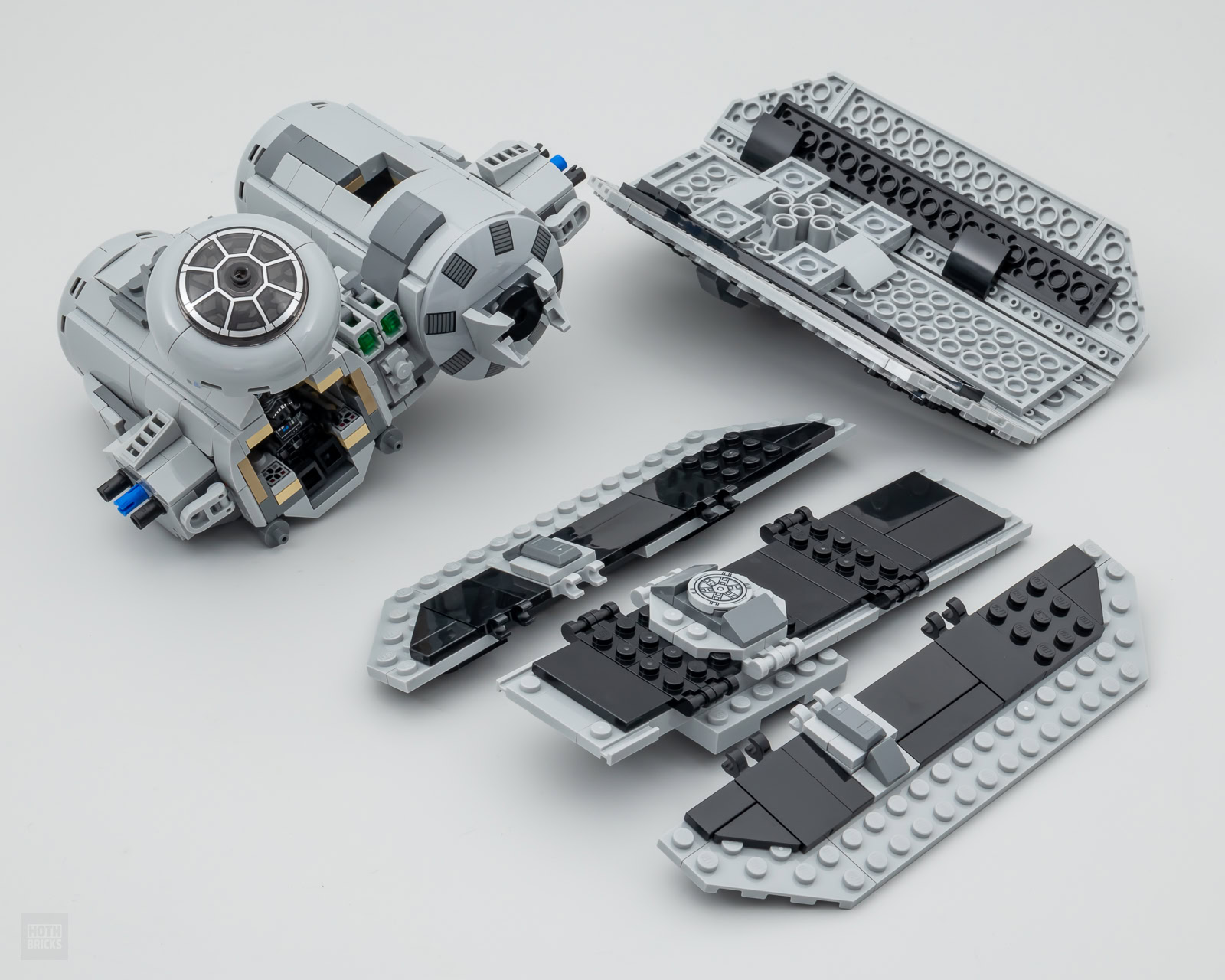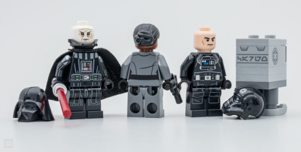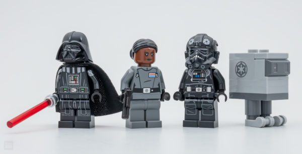 Du côté des trois minifigs livrées dans cette boite, il faut composer avec un mélange d'éléments inédits et de pièces plutôt courantes au catalogue LEGO. Darth Vader profite bien ici d'un nouveau visage plutôt réussi mais se contente de réutiliser le torse et les jambes déjà vus dans plusieurs sets depuis 2020. Le pilote du TIE Bomber est inédit et joliment exécuté, les collectionneurs devraient y trouver leur compte et Rae Sloane (un personnage vu dans quelques romans, comics et dans le jeu vidéo Star Wars : Squadrons) dispose d'un joli torse féminisé flanqué des galons de vice-amiral.