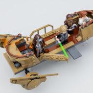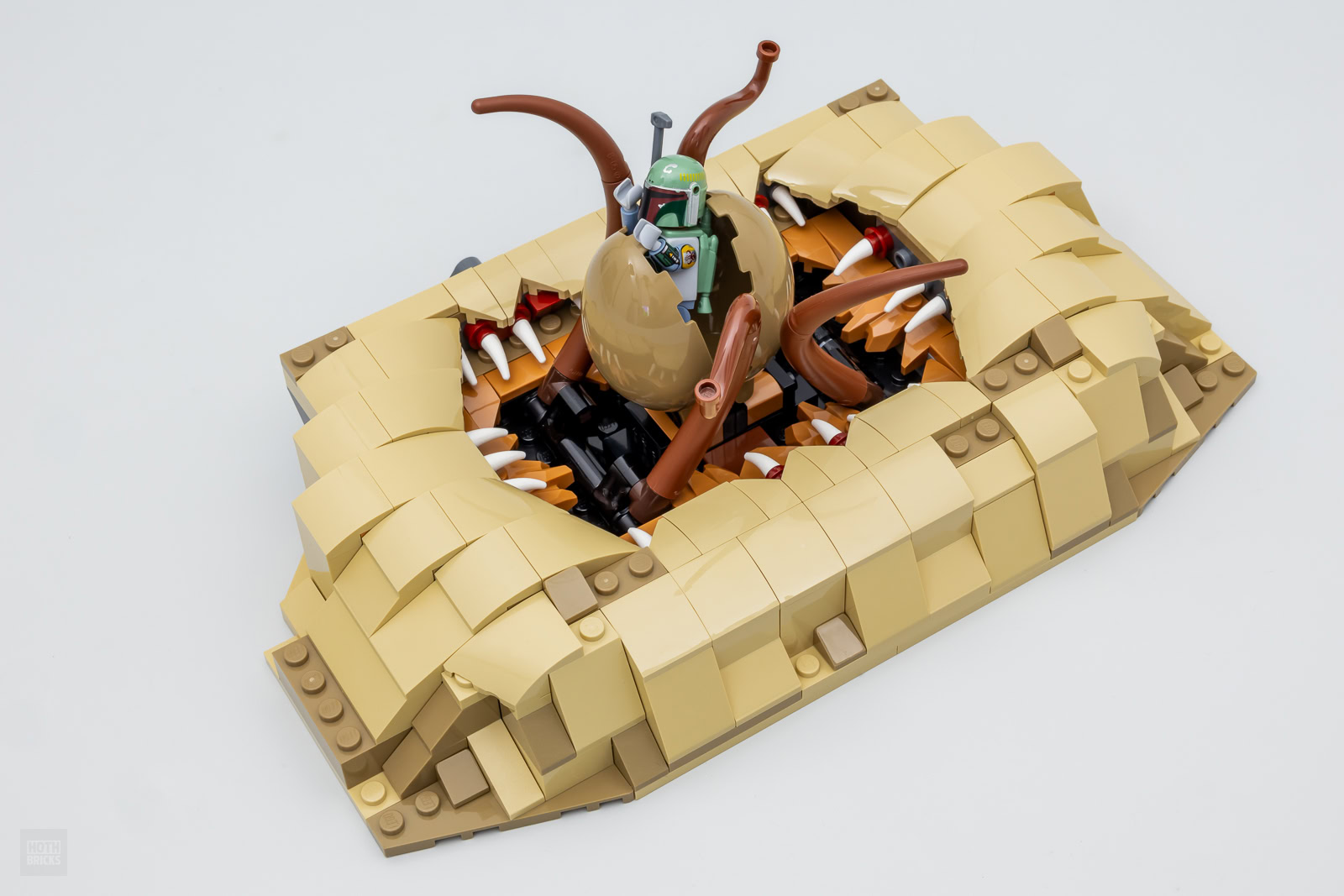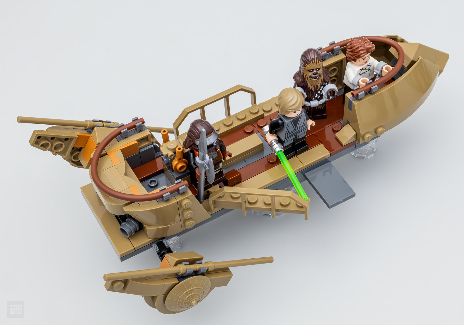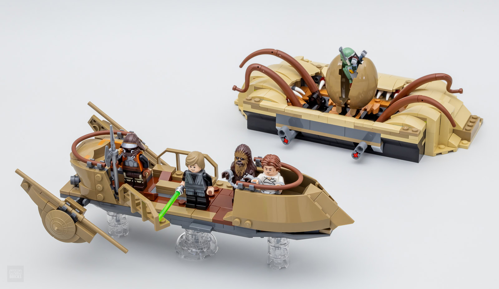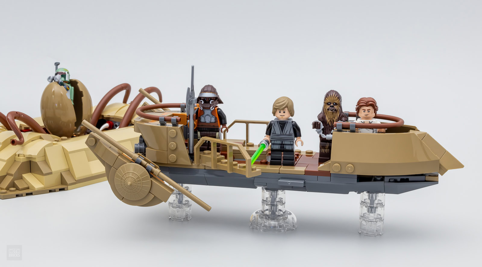 Ce n'est pas la première fois que LEGO propose un produit dérivé associant le Desert Skiff et le Sarlacc, les collectionneurs de longue date se souviennent forcément du set 6210 Jabba's Sail Barge (781 pièces - 74,99 €) vendu en 2006, de la référence 9496 Desert Skiff (213 pièces - 33,99 €) lancée en 2012 ainsi que du set 75174 Desert Skiff Escape (277 pièces - 39,99 €) commercialisé en 2017, mais on assiste ici à une inversion du rapport de taille entre les deux éléments du set avec un Sarlacc Pit qui prend plus d'ampleur face à un Skiff qui reste une interprétation toujours aussi modeste de l'engin.