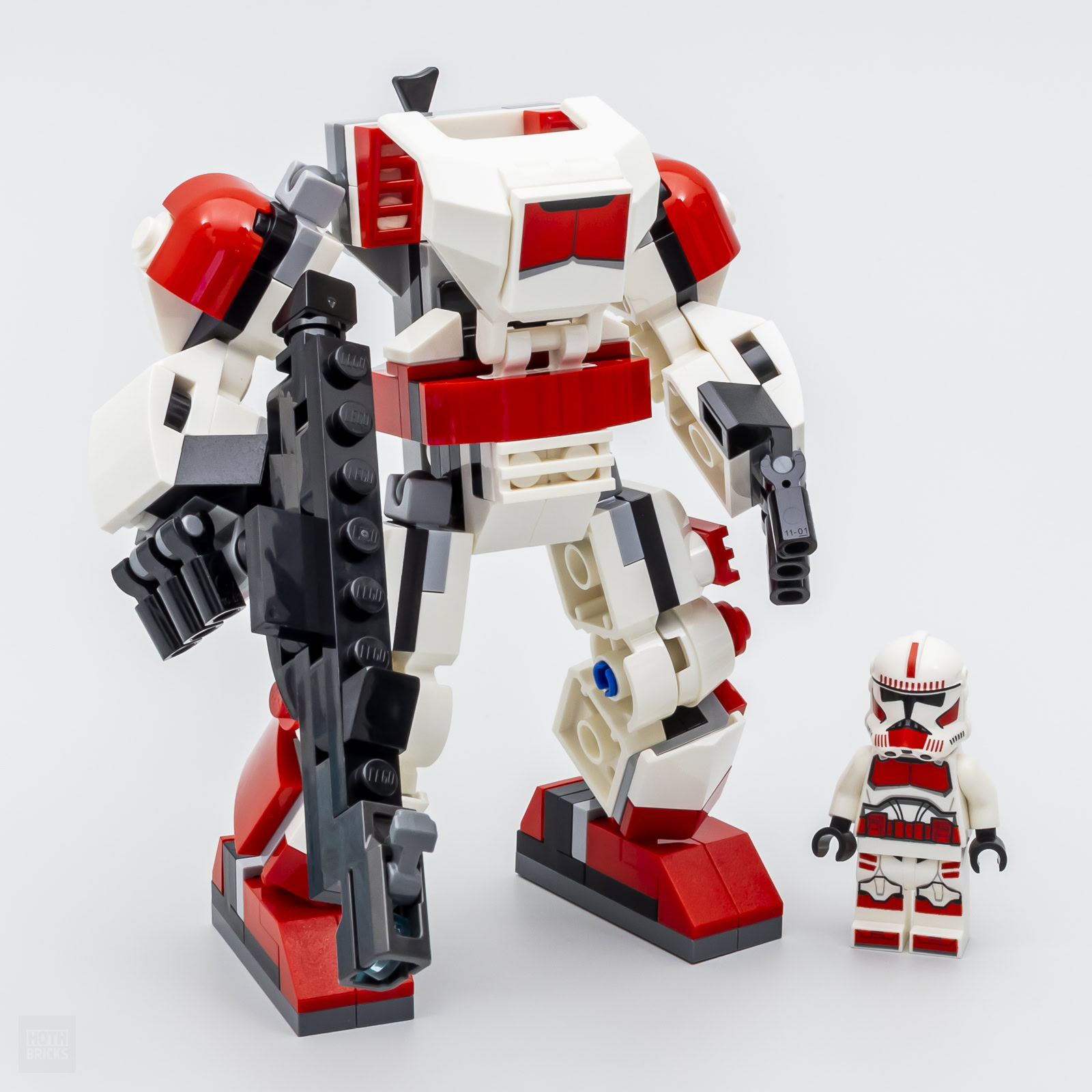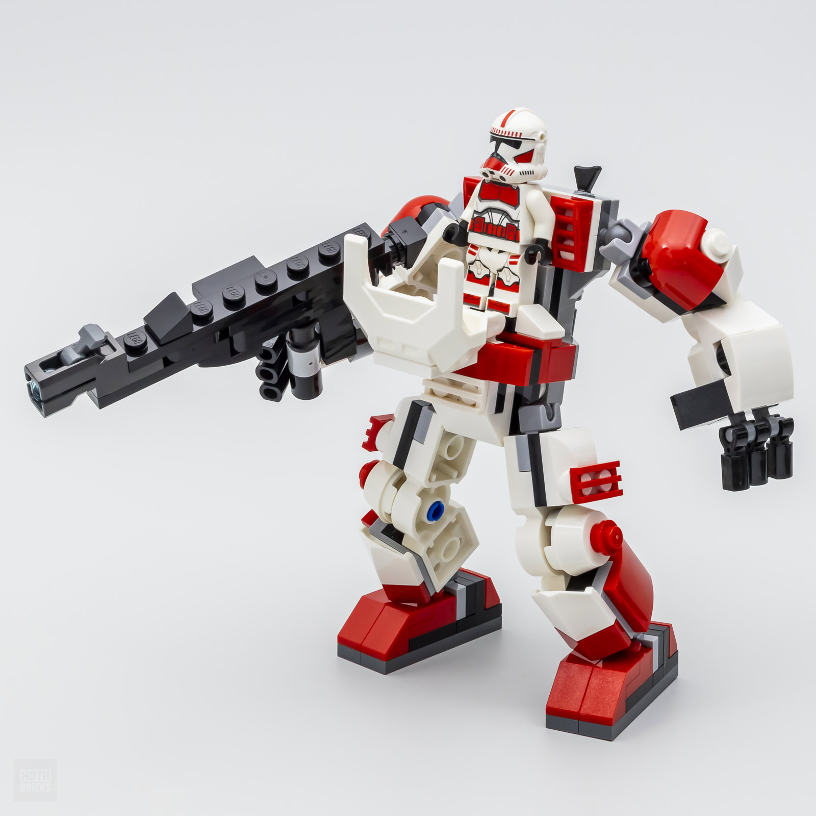 Ici, la construction est associée à un Clone Shock Trooper dont elle reprend les codes et les coloris de l'armure. C'est plutôt bien fait si on oublie les genoux et les coudes fixes ainsi que les rotules grises qui restent bien visibles et si on peut souvent remettre en cause l'intérêt pour le personnage concerné d'avoir sous la main un mech, surtout si le héros en question est doté de super pouvoirs, cette déclinaison ne me semble finalement pas totalement hors sujet.