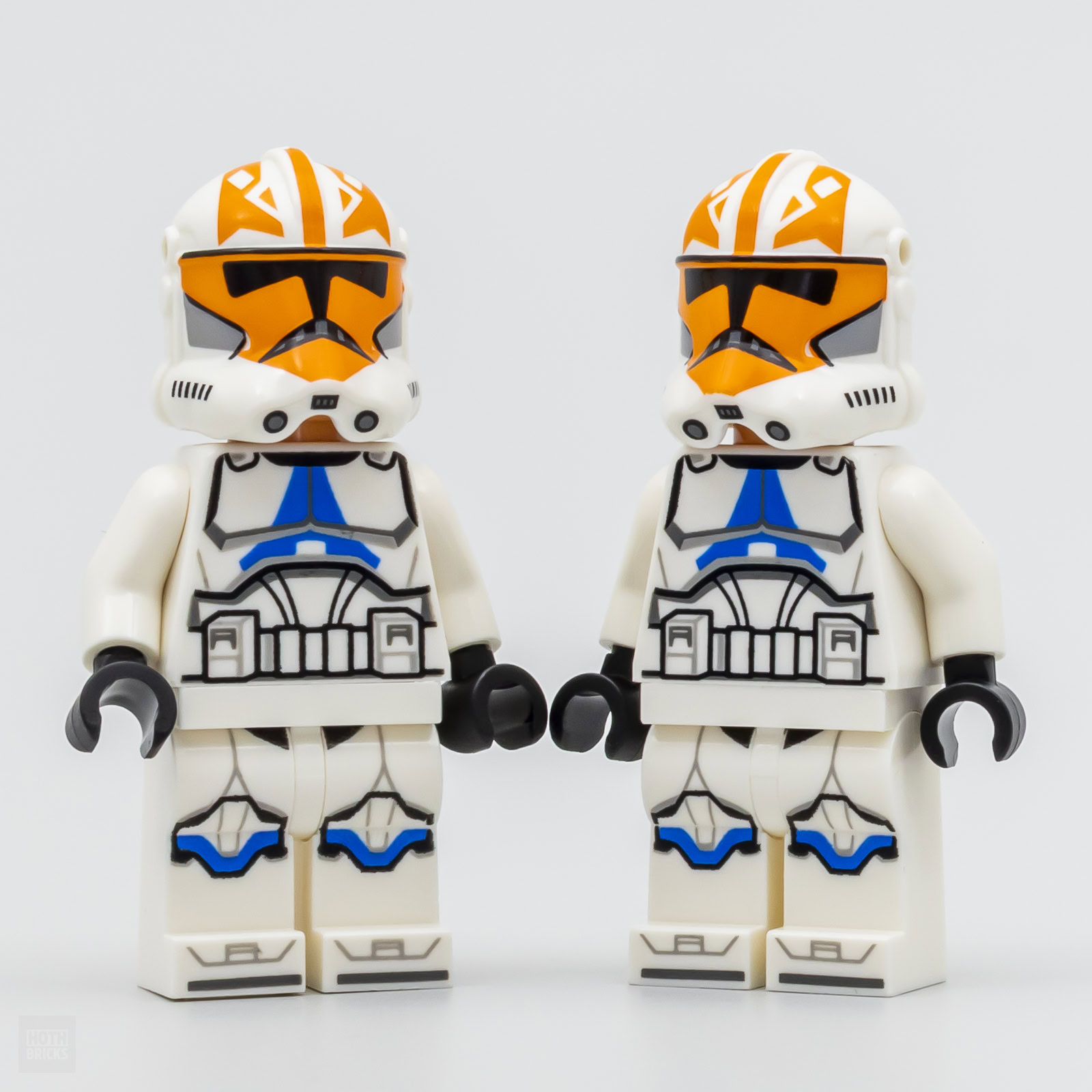 Ces figurines sont celles déjà vues à l'identique dans le set LEGO Star Wars 75359 Ahsoka's 332 Company Clone Troopers Battle Pack en 2023 mais les différents éléments qui les composent, casque, torse et jambes, portent de nouvelles références. Pas de jetpacks pour les deux Clone Troopers.