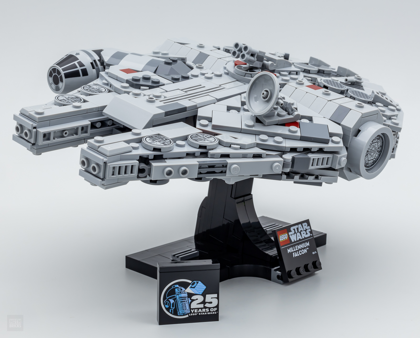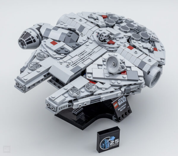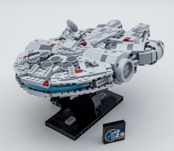 Le set est flanqué d'une petite plaque confirmant à tous ceux qui n'ont aucune idée du sujet traité qu'il s'agit bien du Millennium Falcon ainsi que d'une jolie brique célébrant les 25 ans de la gamme LEGO Star Wars. Ces deux éléments tampographiés renforcent évidemment le côté "collector" du produit, on ne va pas s'en plaindre.