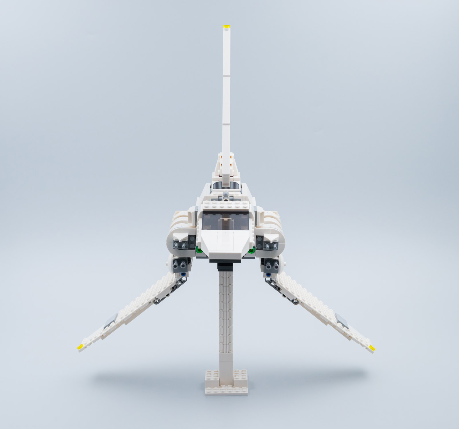 LEGO n'a rien prévu pour ceux qui voudraient exposer la navette avec les ailes déployées, il faudra bricoler un support. J'ai simplement empilé quelques briques pour les photos et en trouvant le point d'équilibre il est possible de placer le vaisseau sur une simple tige. Dommage que LEGO ne propose pas une solution intégrée au set. Même s'il s'agit d'un simple jouet, il serait intéressant de disposer d'un socle pour permettre de le ranger sur une étagère dans sa configuration le plus intéressante et une quinzaine de pièces suffit ici pour obtenir l'effet escompté.