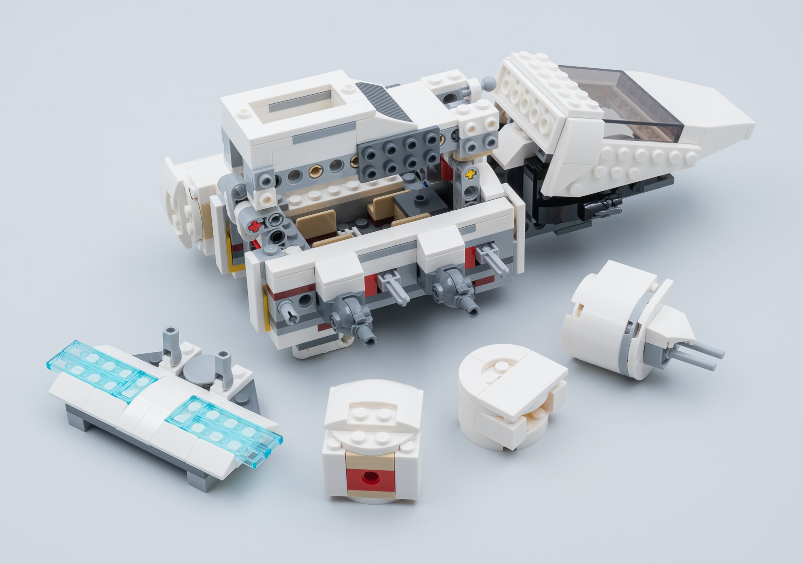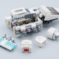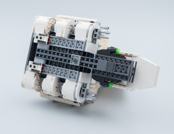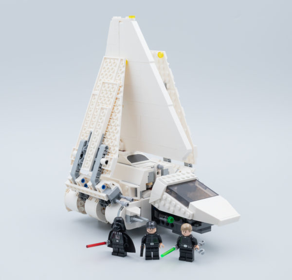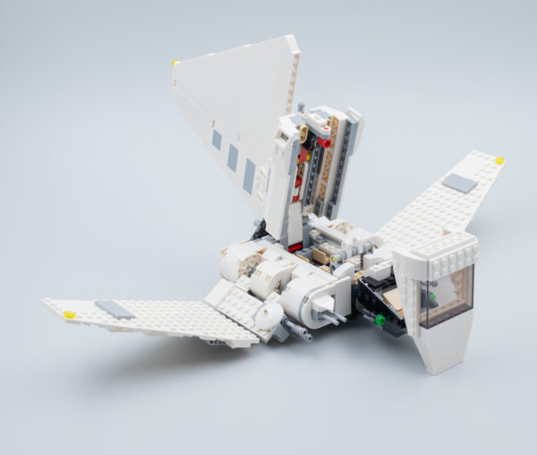 Ce produit est surtout un jouet pour enfants et il fallait donc penser à ceux qui s'amuseront avec cette navette. La coque supérieure du poste de pilotage bascule vers l'avant et l'intérieur du vaisseau est accessible en soulevant l'aileron central qui est retenu par un loquet relativement discret. C'est simple, ça ne pénalise pas l'esthétique générale et ces deux fonctionnalités offrent une jouabilité certaine au produit. Même si le poste de pilotage ne peut accueillir qu'une seule minifig, les trois personnages fournis peuvent donc prendre place dans la navette, Luke Skywalker et Darth Vader disposant de "sièges" à l'arrière.