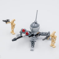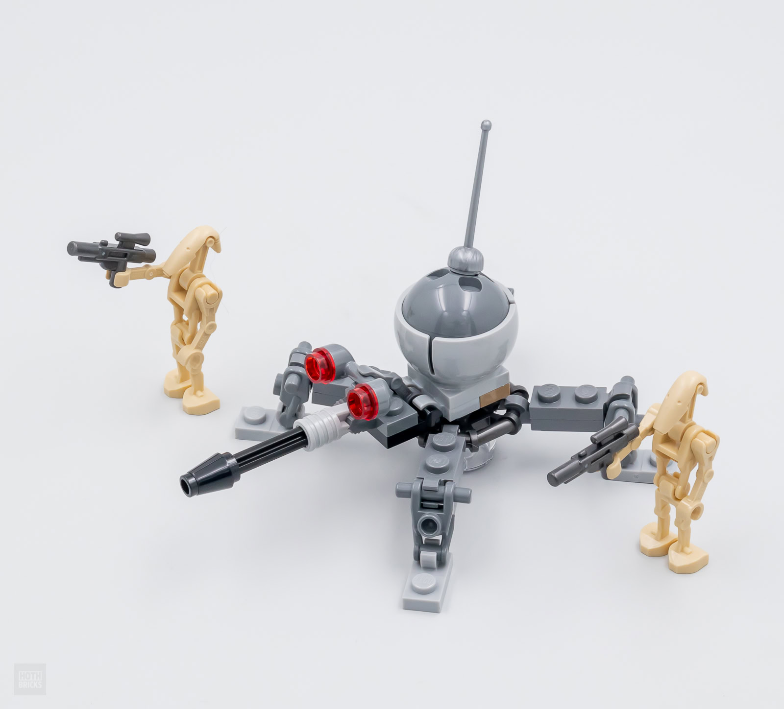 Les trois Battle Droids fournis dans cette boite sont accompagné d'un Spider Droid qui peine un peu servir d'opposition crédible face à l'AT-TE. Un Crab Droid aurait peut-être été plus à-propos pour offrir quelque chose de plus consistant et être totalement fidèle à l'affrontement vu à l'écran. Le Spider Droid est d'une relative simplicité, il est correctement exécuté mais il n'est pas équipé d'un Stud-Shooter qui aurait pu apporter un peu de jouabilité.
