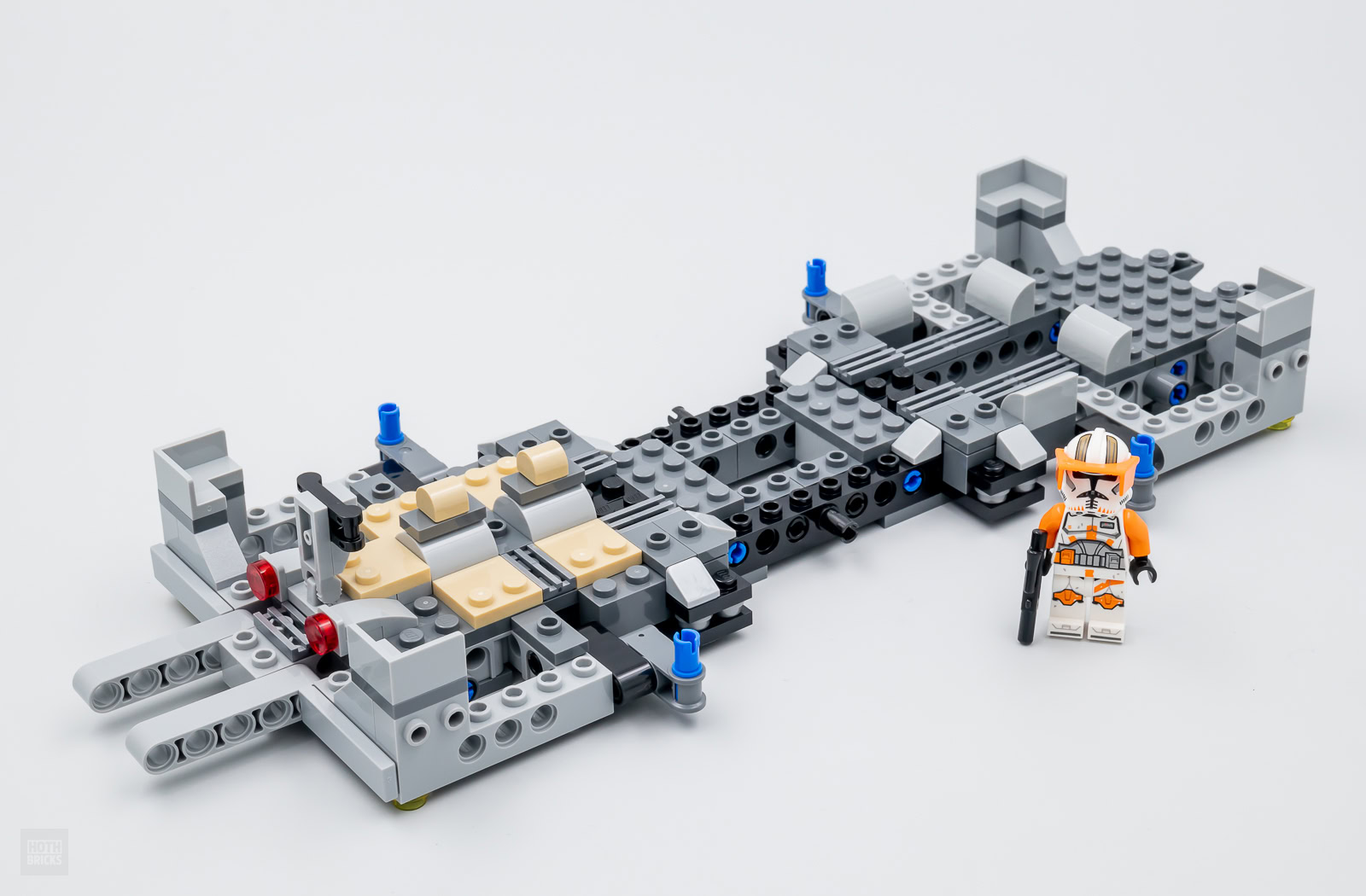 Le poste de pilotage est amovible, on peut y installer un Clone et ce sous-ensemble ne risque pas de se détacher grâce à un axe Technic qui vient empêcher le tout de sortir de manière intempestive de ses rails. On trouve deux Stud-Shooters de nouvelle génération sous le canon principal, ils sont parfaitement intégrés mais ils peuvent aussi être retirés si leur présence vous gêne.