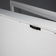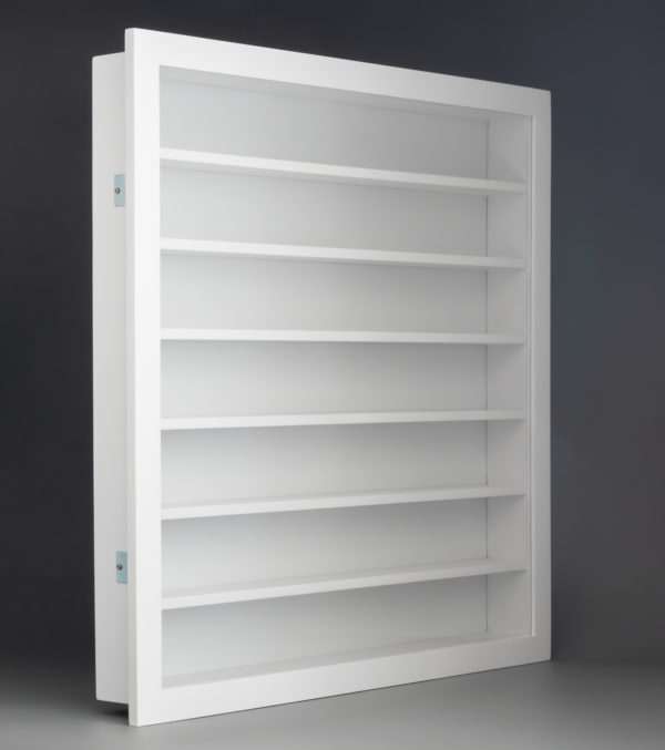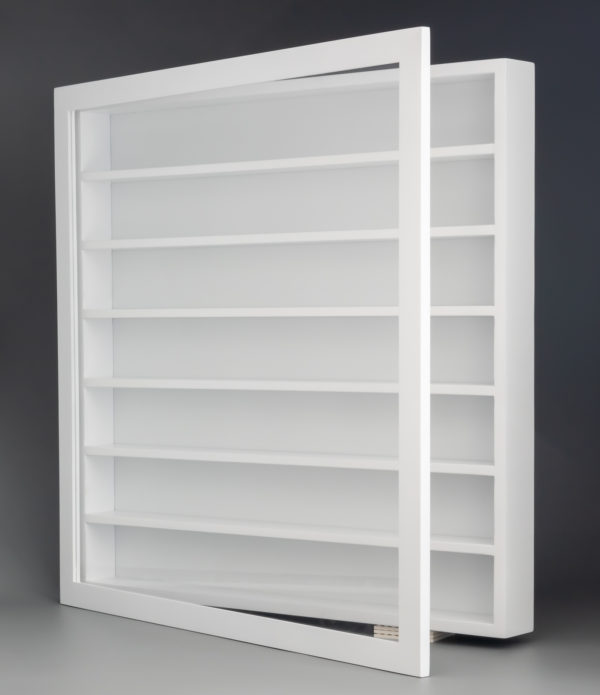 Le conditionnement est bien pensé, l'objet est livré avec sa face avant démontée dans un carton bien garni en protections diverses et variées. Le plexiglass est protégé par du film plastique, on évite les rayures et la probabilité de recevoir une vitrine en bon état est donc maximale. Je suis un peu moins convaincu par la nécessaire phase d'assemblage de la porte avant sur le châssis : il faut installer deux charnières à l'aide de quatre vis et ces deux éléments ne sont pas peints en blanc. Les deux charnières ne seront plus vraiment visibles puisqu'elles sont ensuite visuellement dissimulées par le rebord de la face avant mais il faudra penser à choisir le sens d'installation de la vitrine sur le mur choisi pour ne plus les voir en passant devant. Le sens de la porte se définit tout simplement en retournant la vitrine sur 180°.