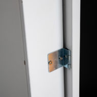 Pas de loquet de fermeture de la porte, c'est un peu dommage car les charnières basiques fournies sont très fluides et il n'y a pas de cran de fermeture. Attention de ne pas accrocher le bord de la porte si la vitrine est installée dans un couloir un peu étroit ou sur un point de passage. La finition de l'ensemble est globalement satisfaisante de face, le dos du produit est un peu plus sommaire avec des agrafes visibles pour fixer le fond. Quatre crochets sont préinstallés pour permettre l'accrochage de cette vitrine de 5kg (vide) au mur, dans les deux sens en fonction de votre choix pour l'ouverture de la porte. La vitrine devra impérativement être installée sur un mur, elle ne tient pas debout si elle est simplement posée sur une étagère en raison du débord de la face avant.