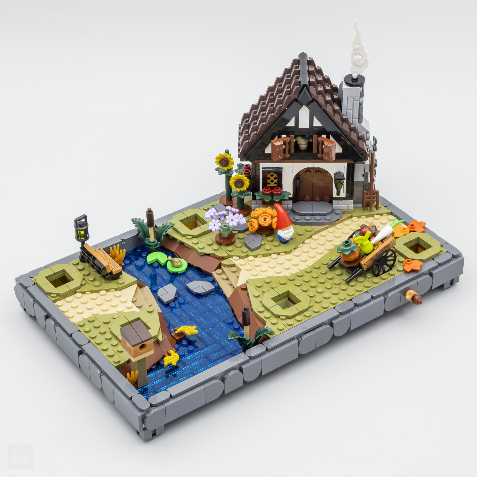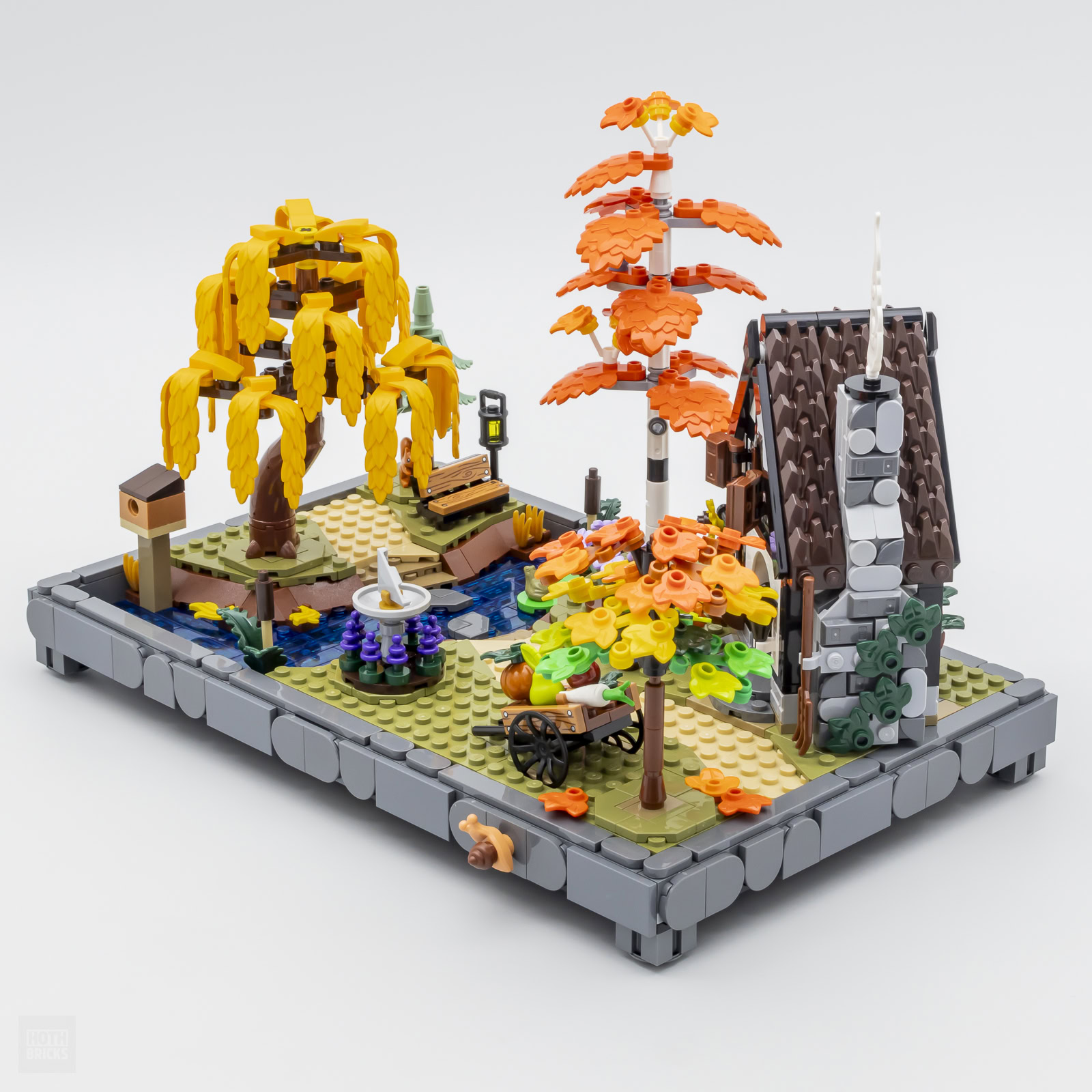 En marge de la végétation aux couleurs automnales fournie avec un bouleau, un saule pleureur avec son feuillage inédit, un épicéa et un érable, on obtient également quelques petits animaux avec un rouge-gorge, une sittelle, un écureuil, une grenouille et un escargot. Pas de sanglier, de loutre, de blaireau ou de cerf, c'est un peu dommage de n'avoir ici que de petits animaux. On obtient en revanche un nain de jardin, c'est kitsch et ringard mais c'est dans le thème. Pas de minifig dans cette boite, pas même un chasseur ou un jeune cadre dynamique en week-end. Pas de stickers non plus.