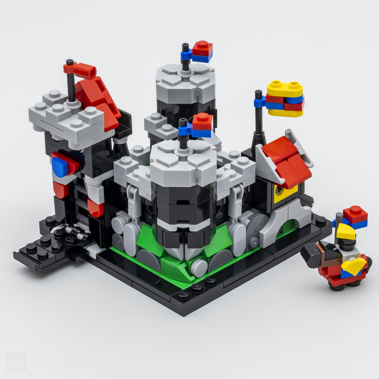Celui du set 6073 Knight's Castle était déjà une construction relativement sommaire à l'époque, il est logique que sa version micro ne fasse pas spécialement d'étincelles. La version incarnant le chateau du set 6086 Black Knight's Castle est en revanche plus cossue, on y retrouve de nombreux détails présents sur la version classique des lieux comme la plaque de base en relief imprimée ou la trappe et le puits qui masquaient alors le trou central de la plaque.