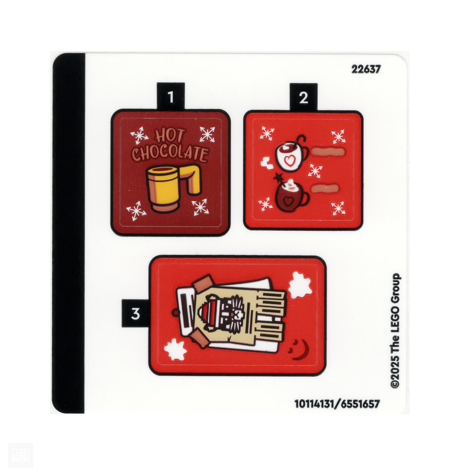 On trouve même dans cette boite deux pièces dorées pour la devanture, on se contente de trois stickers et LEGO nous fournit au passage un exemplaire du "menu" tampographié déjà vu depuis 2023 dans les sets LEGO CITY 60366 Ski and Climbing Center et LEGO IDEAS 21353 Botanical Garden.